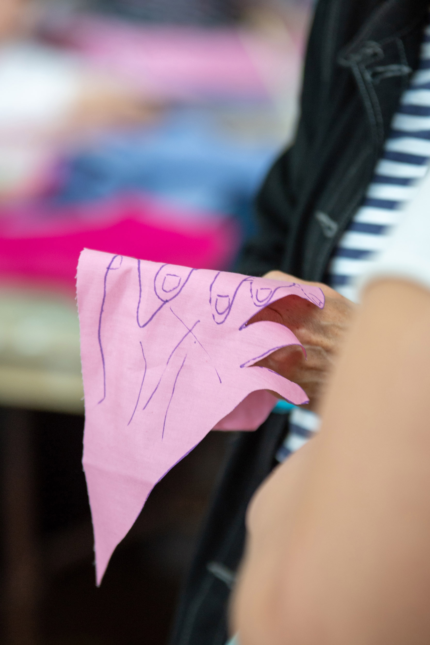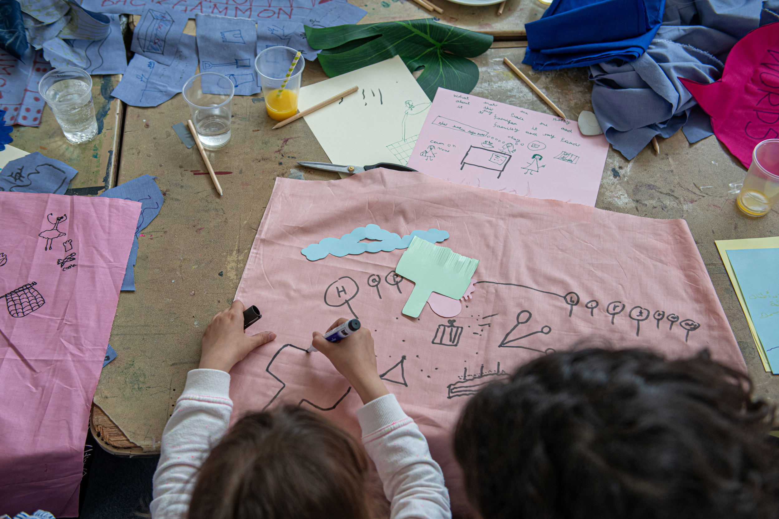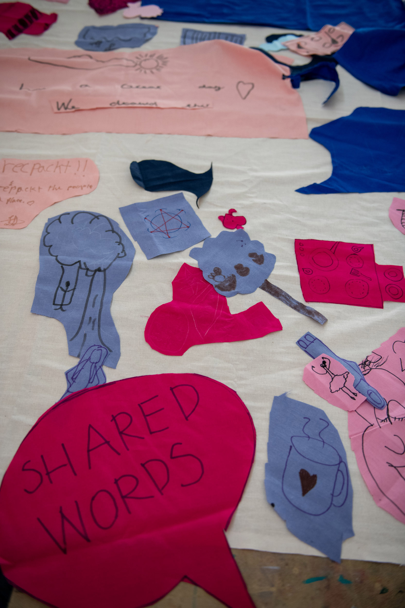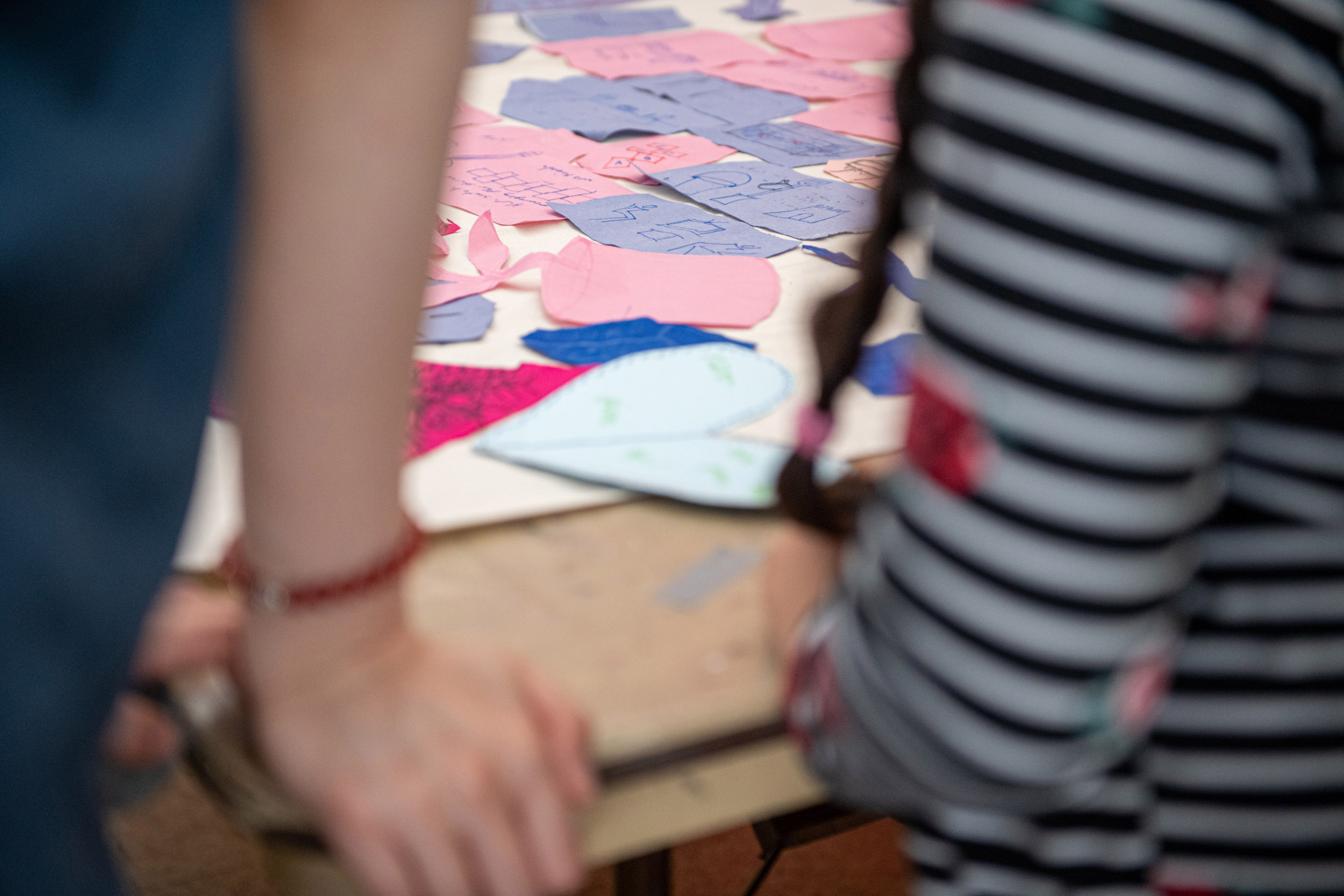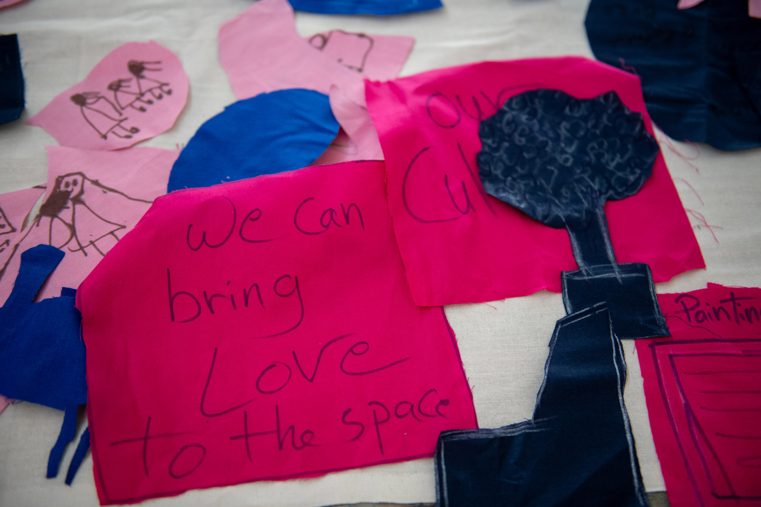 The second question we would like to ask is what we can share in the space? On this table are sheets of pink fabric. We would like you to draw ideas of what you can share in the space with shapes related to those ideas. Again, we can help you draw but we encourage you to be imaginative. After you have finished, we will cut out the fabric and on the back we will write the idea so we can remember what the shape represents.