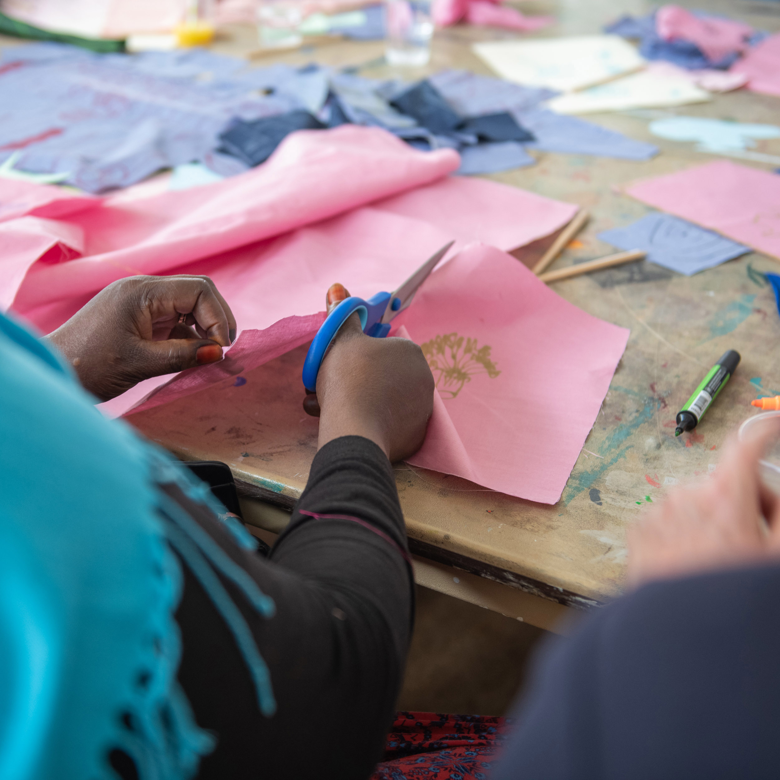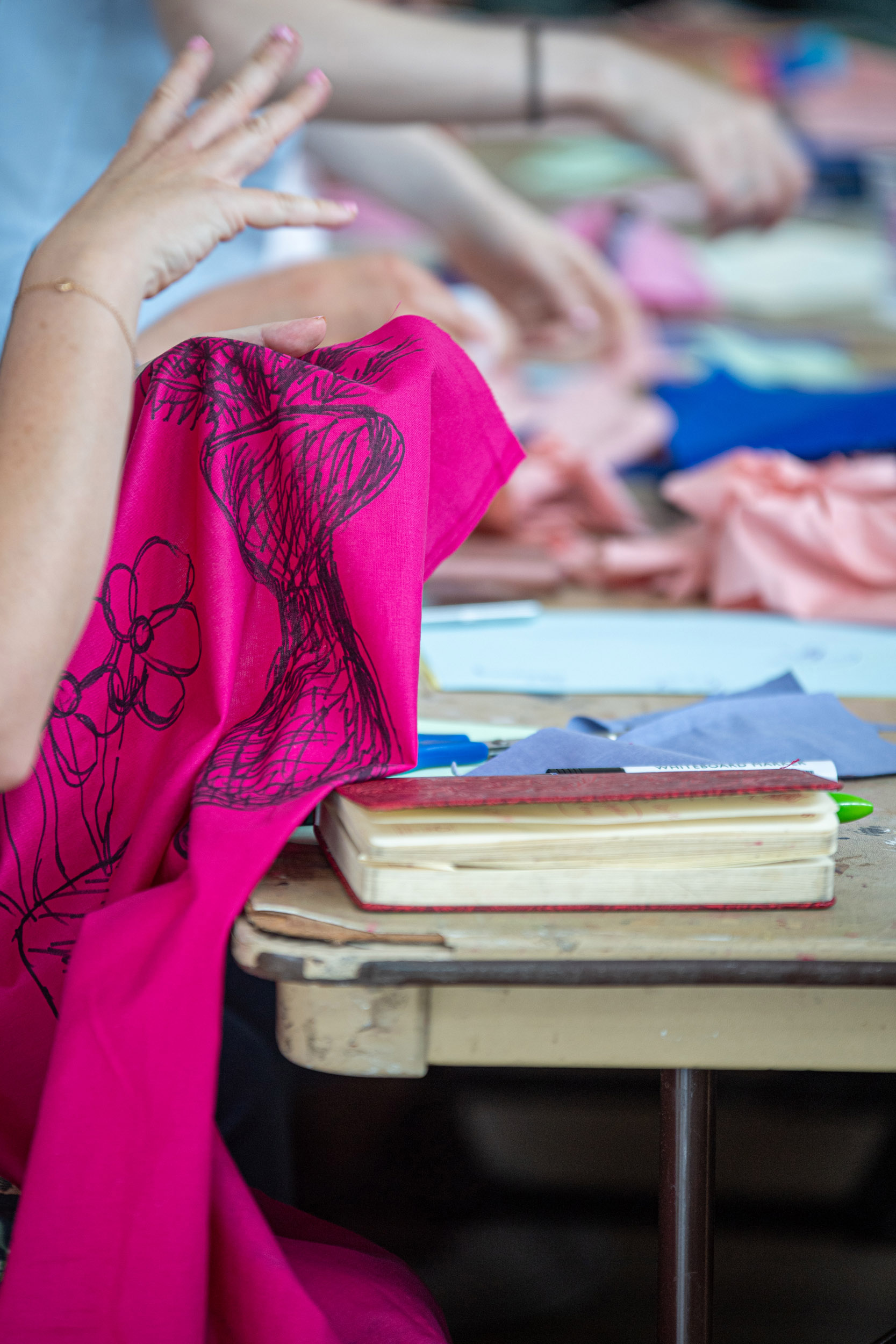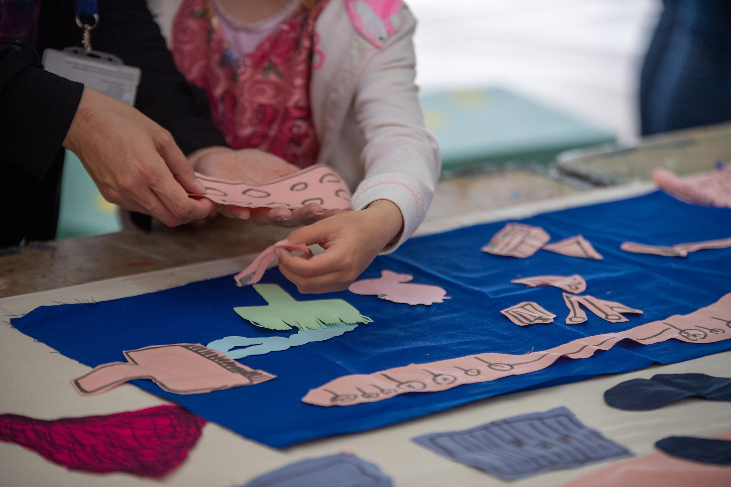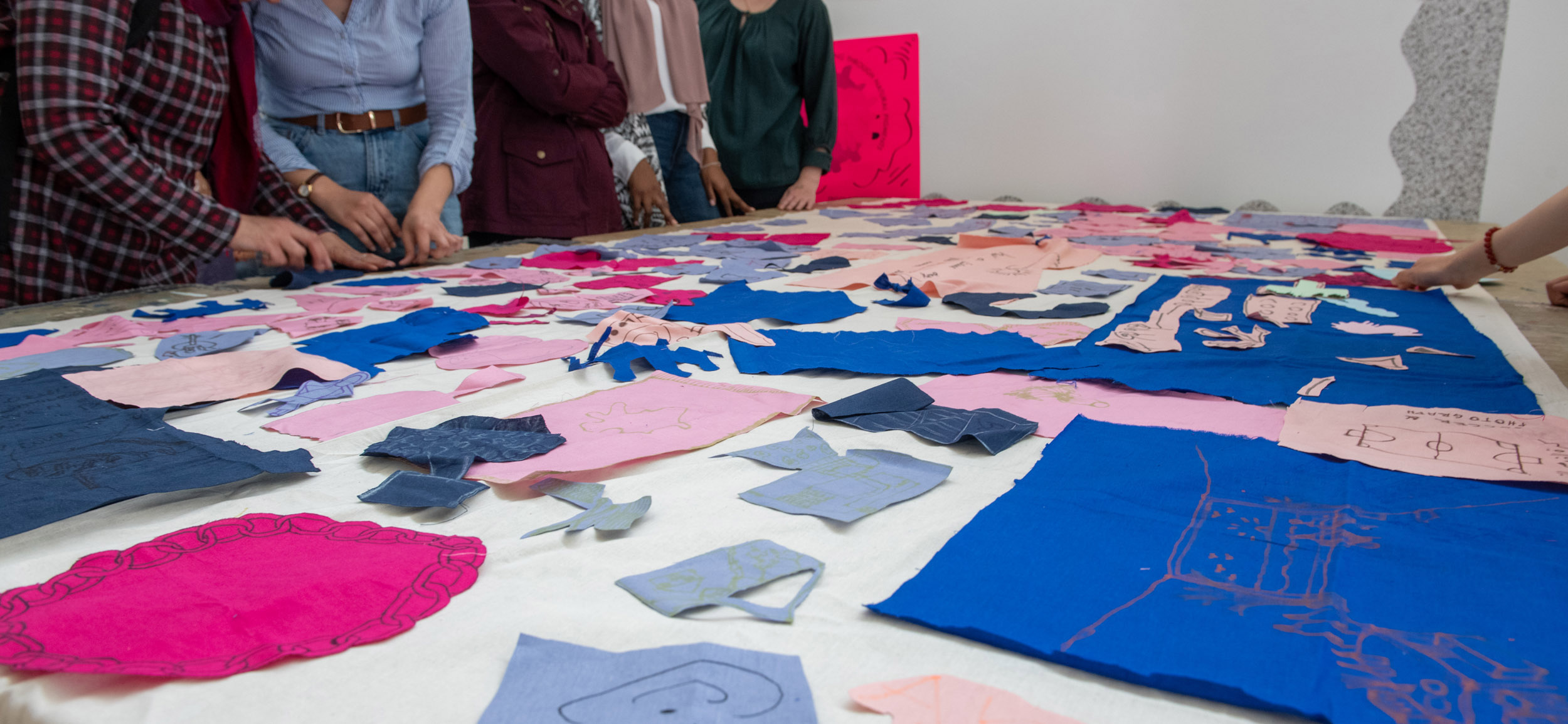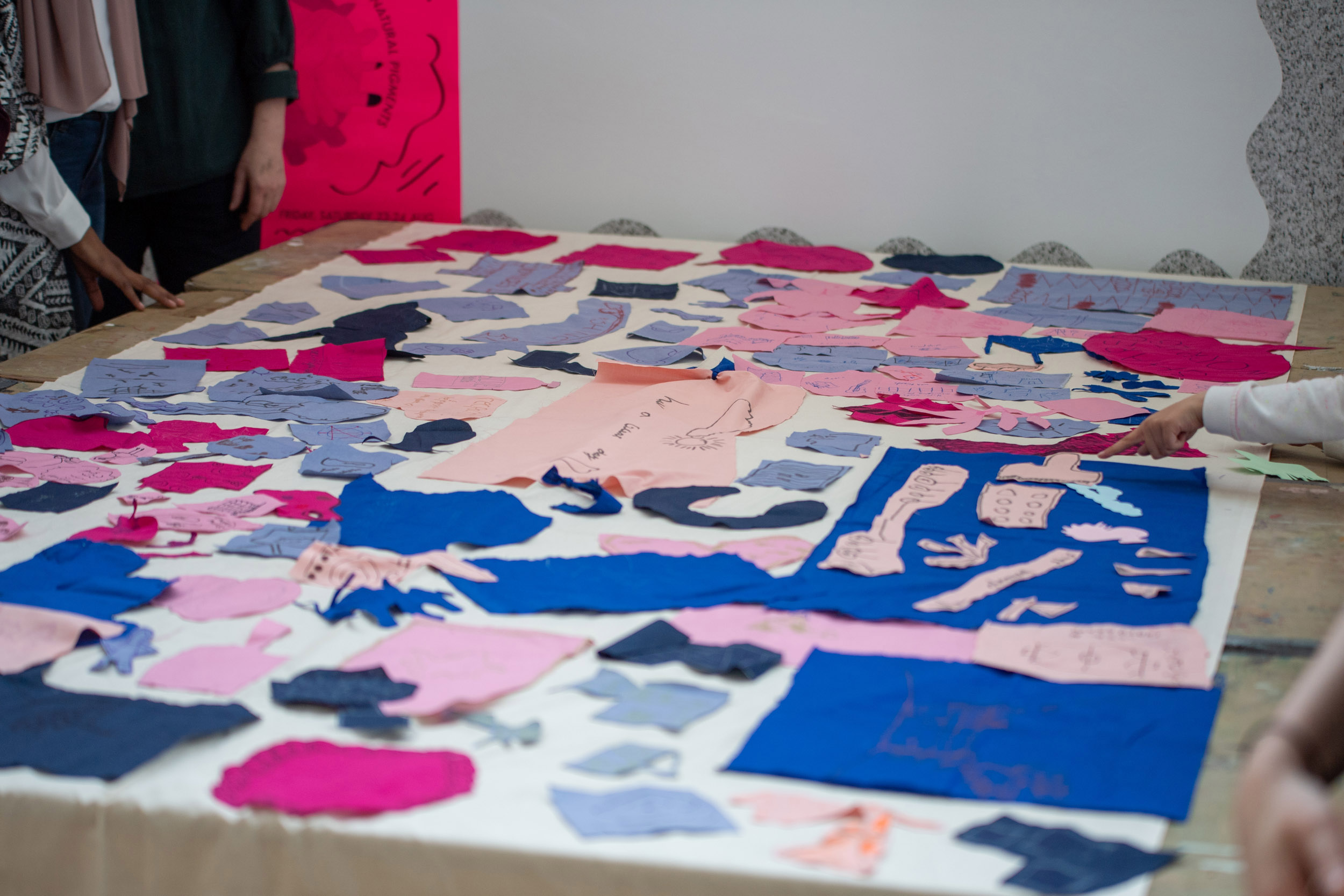 The second question we would like to ask is what we can share in the space? On this table are sheets of pink fabric. We would like you to draw ideas of what you can share in the space with shapes related to those ideas. Again, we can help you draw but we encourage you to be imaginative. After you have finished, we will cut out the fabric and on the back we will write the idea so we can remember what the shape represents.