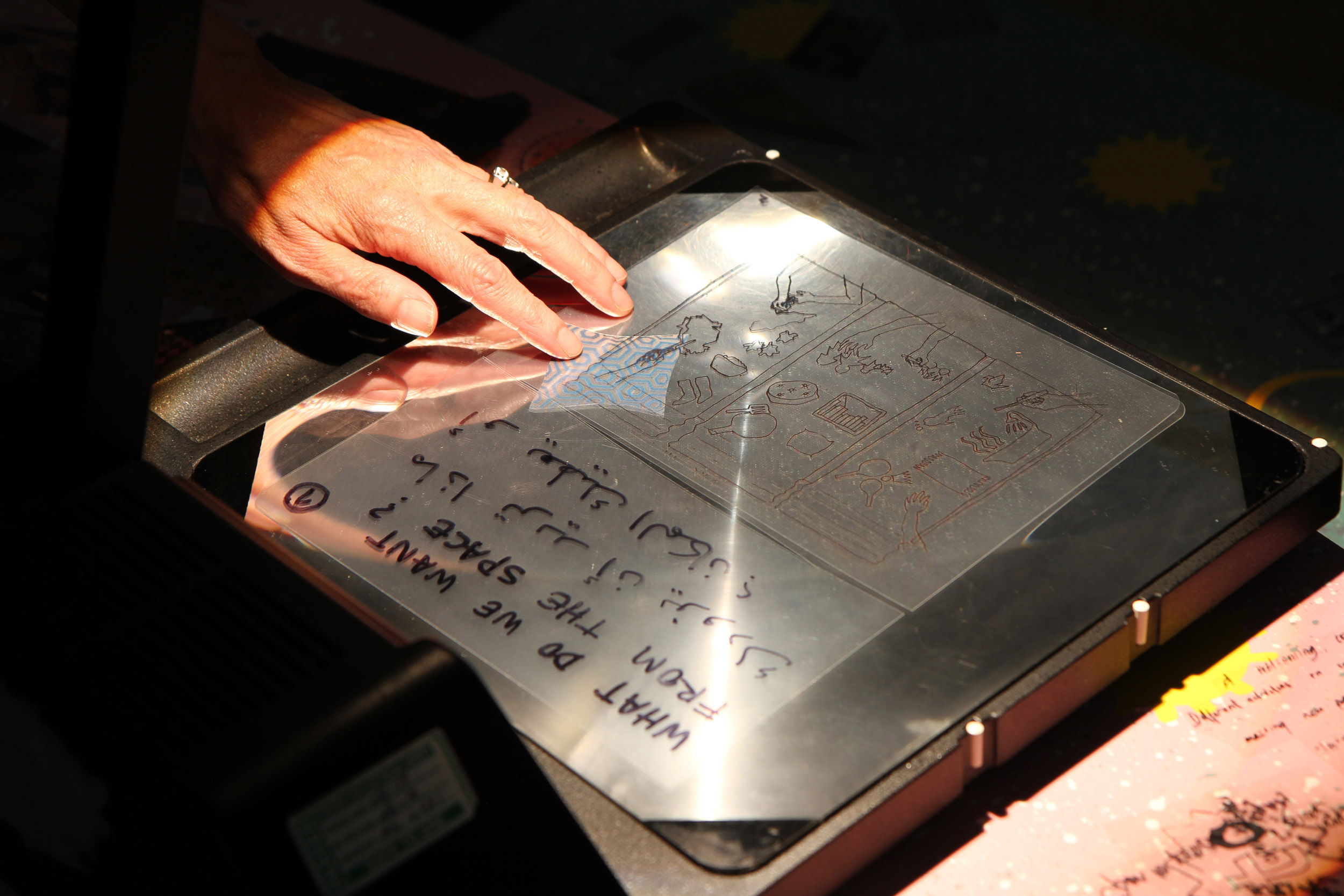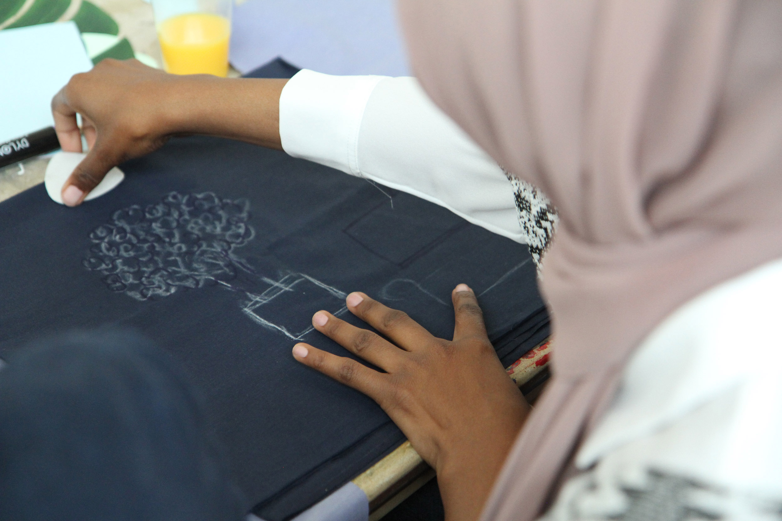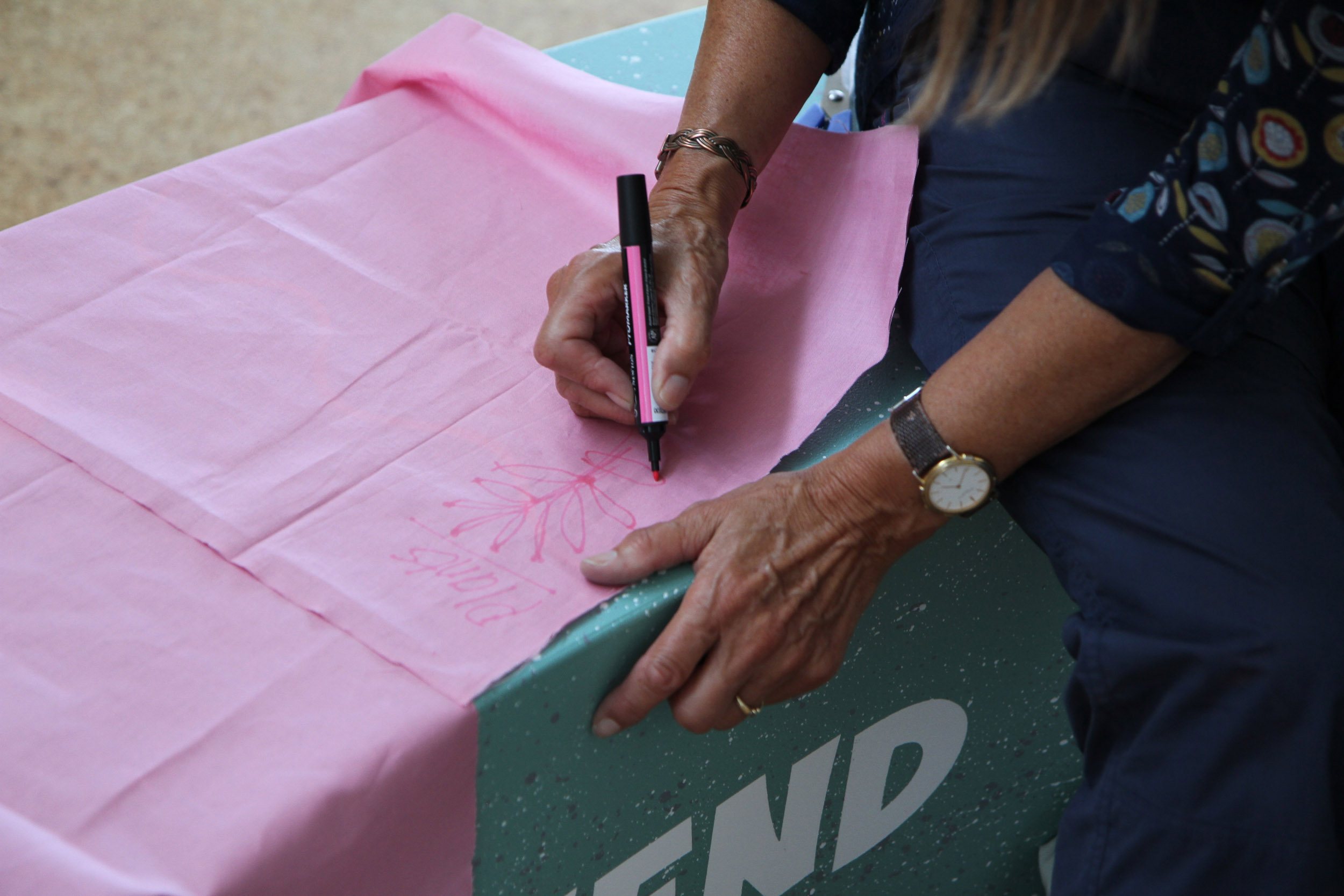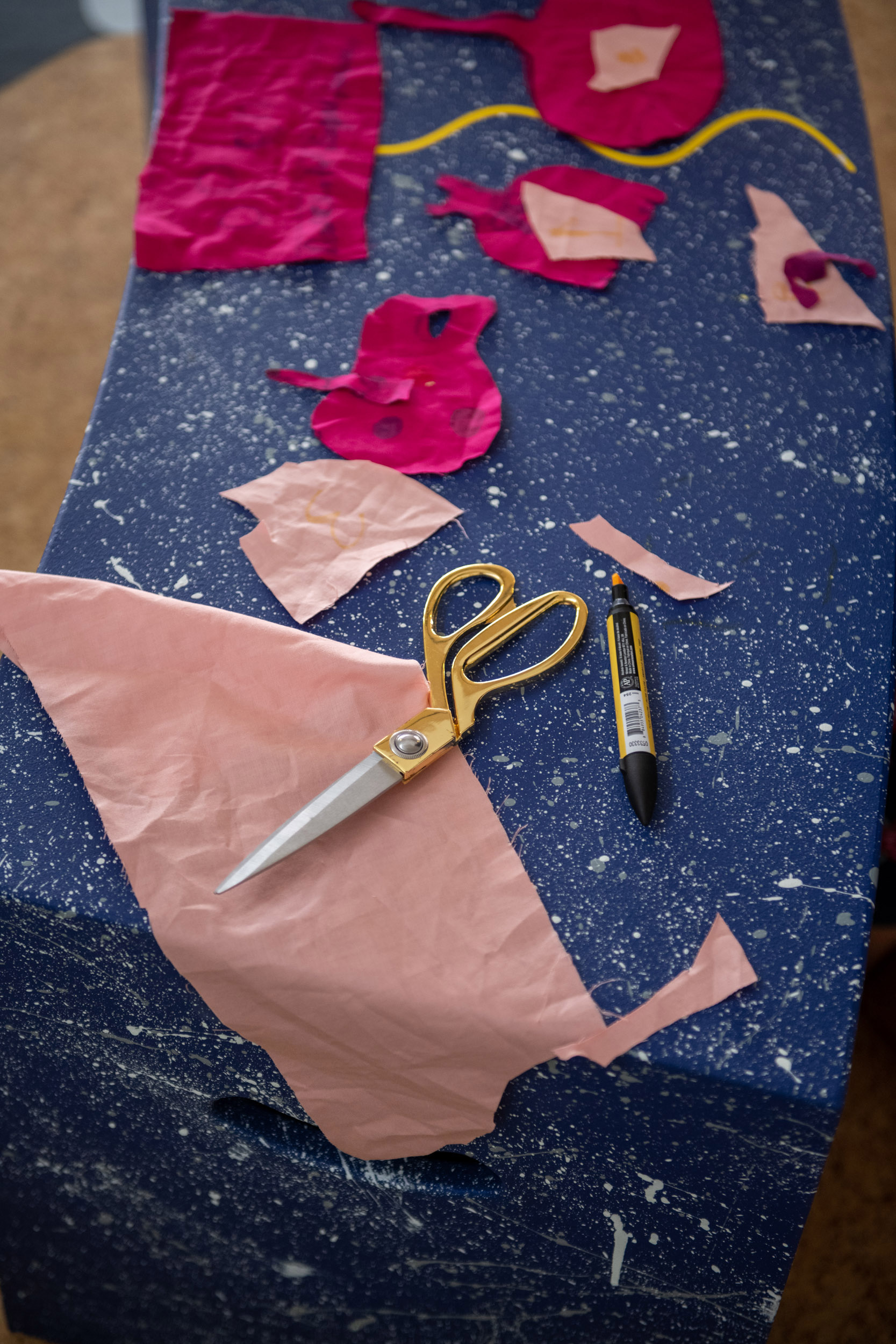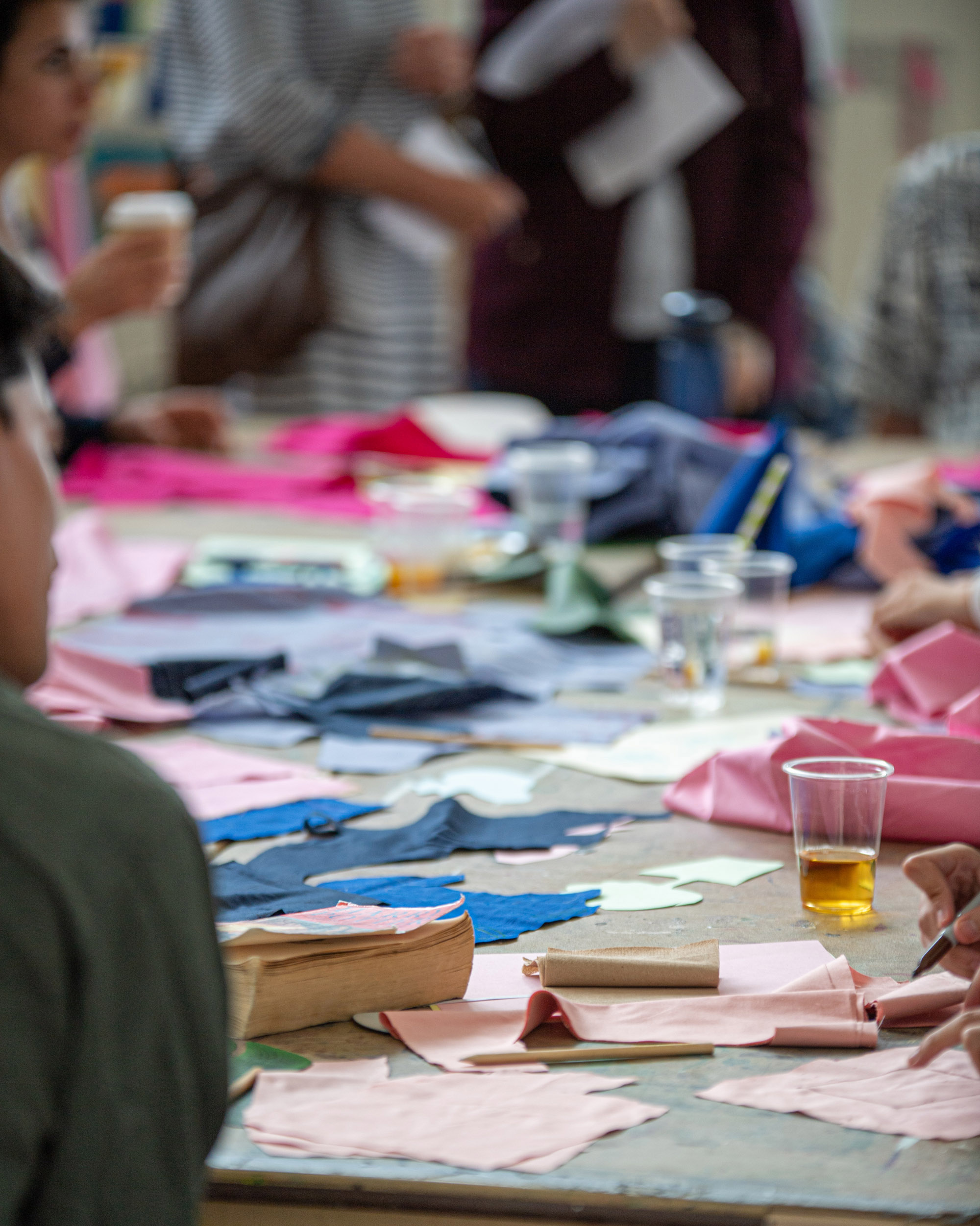 The second question we would like to ask is what we can share in the space? On this table are sheets of pink fabric. We would like you to draw ideas of what you can share in the space with shapes related to those ideas. Again, we can help you draw but we encourage you to be imaginative. After you have finished, we will cut out the fabric and on the back we will write the idea so we can remember what the shape represents.