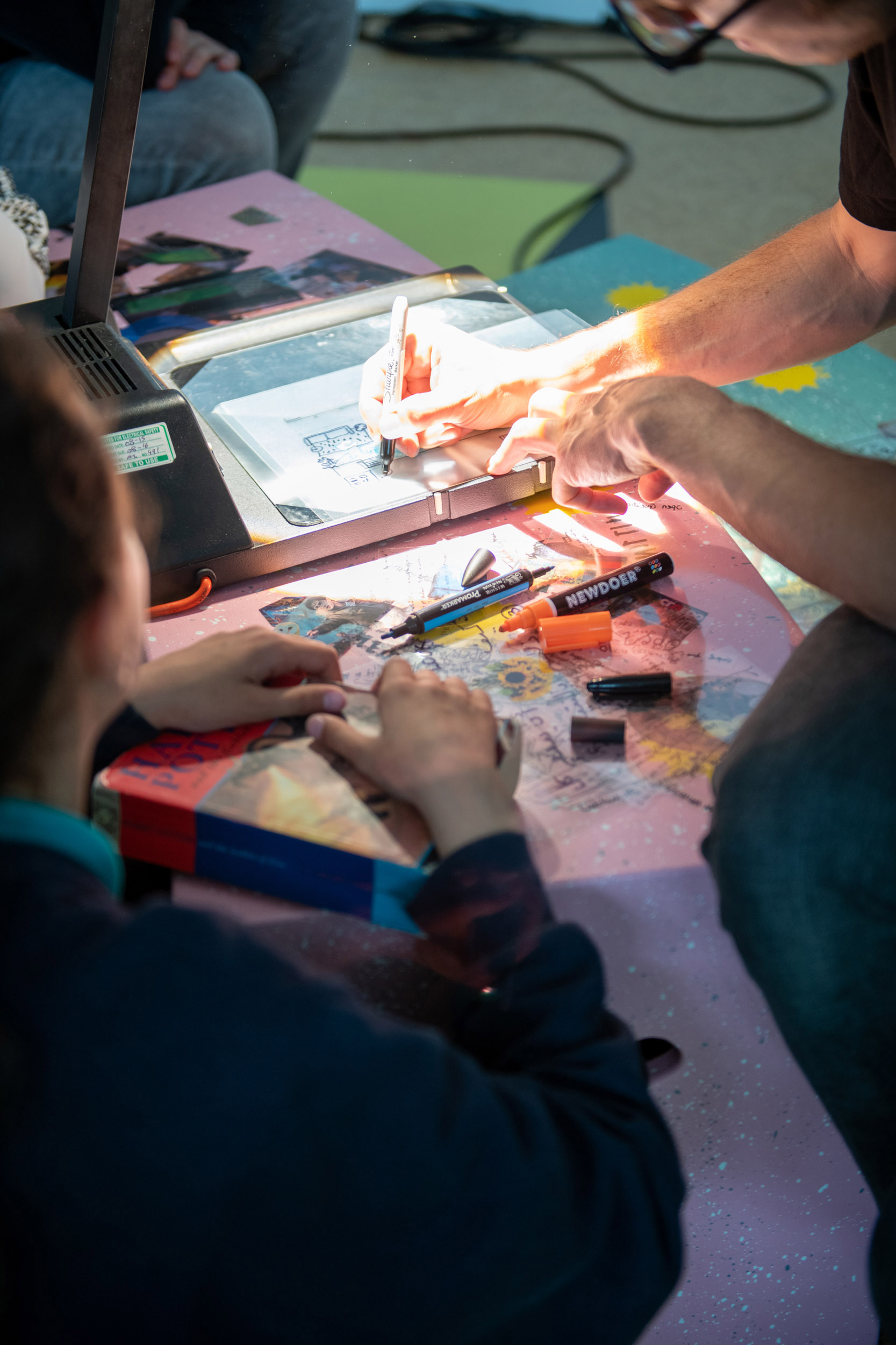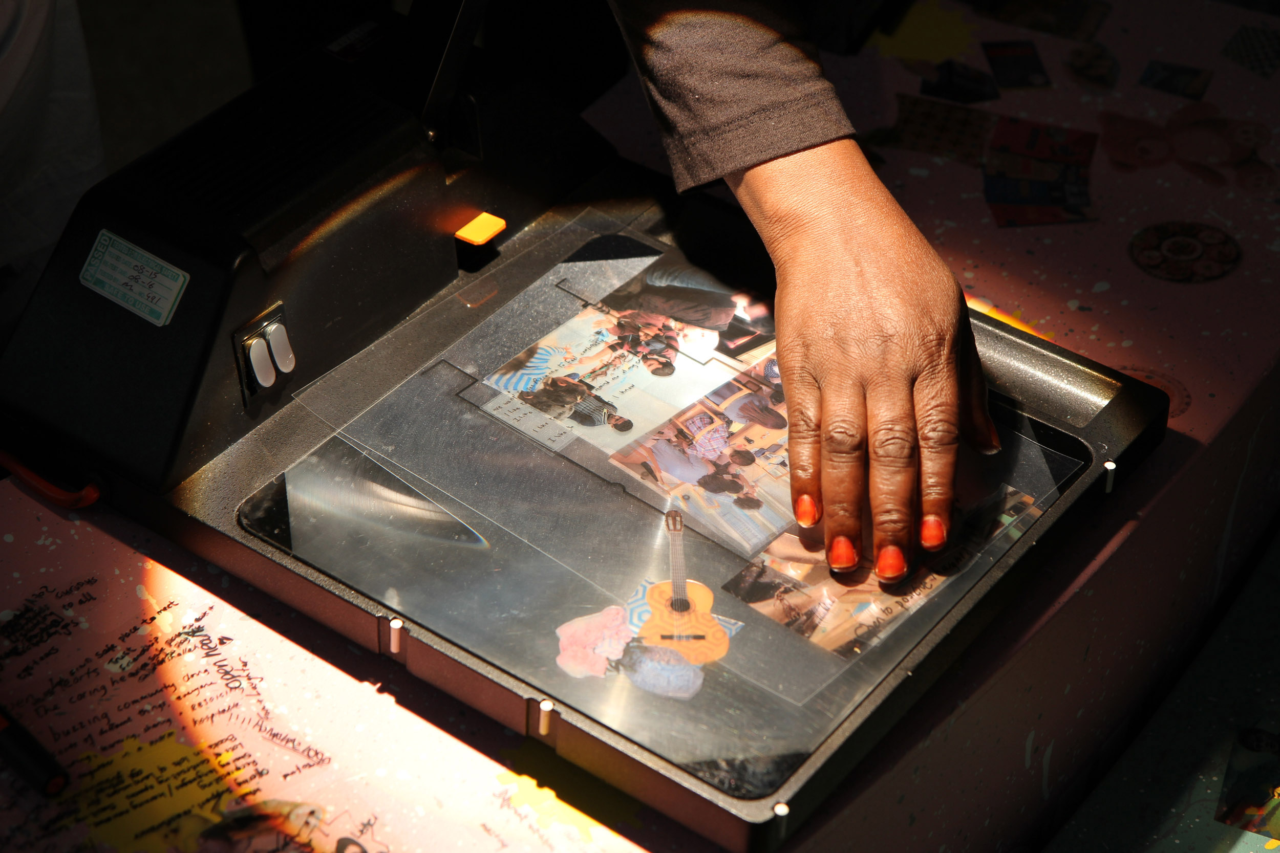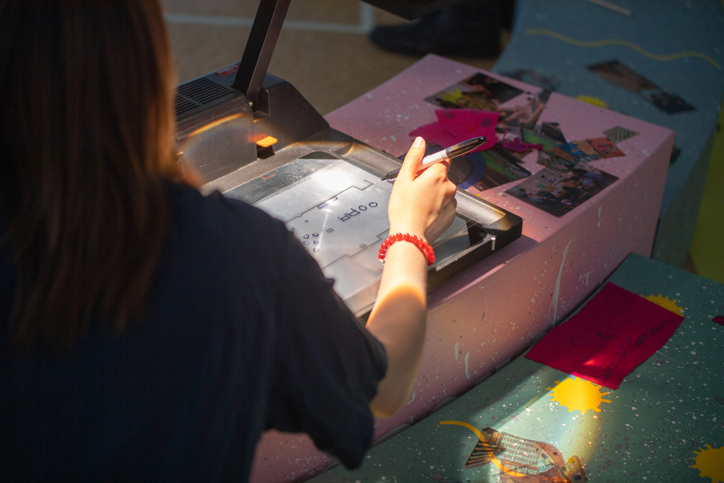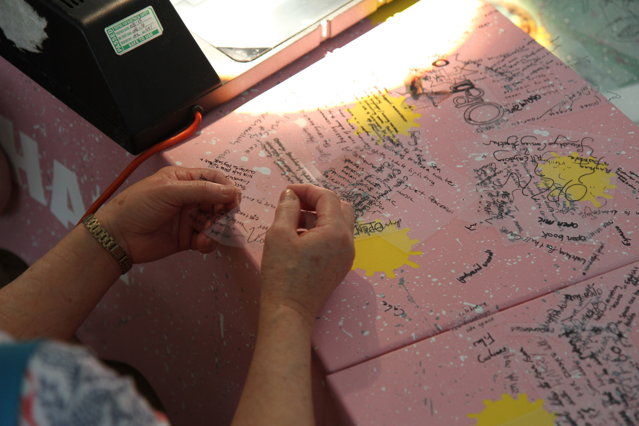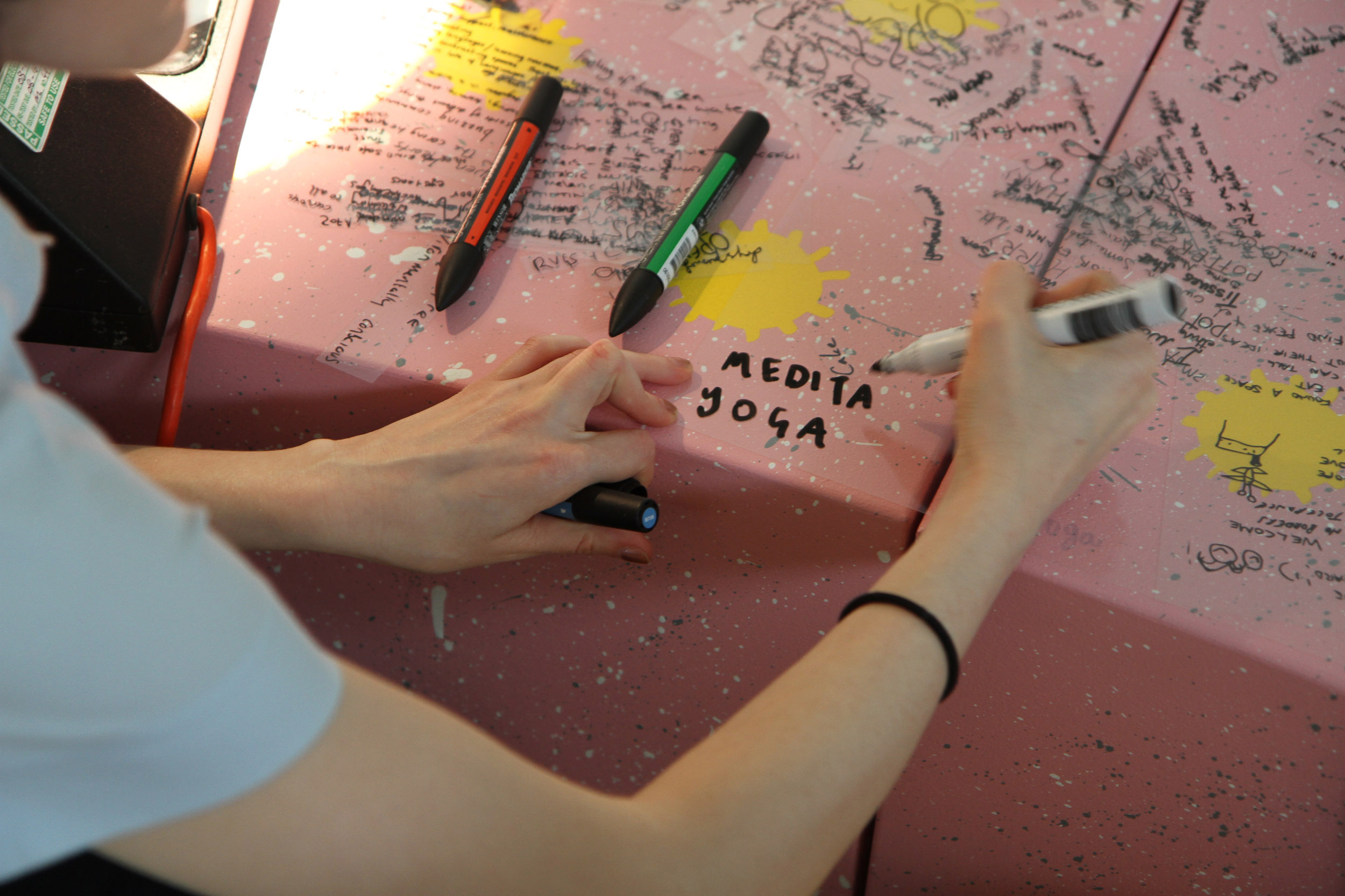 The second question we would like to ask is what we can share in the space? On this table are sheets of pink fabric. We would like you to draw ideas of what you can share in the space with shapes related to those ideas. Again, we can help you draw but we encourage you to be imaginative. After you have finished, we will cut out the fabric and on the back we will write the idea so we can remember what the shape represents.
