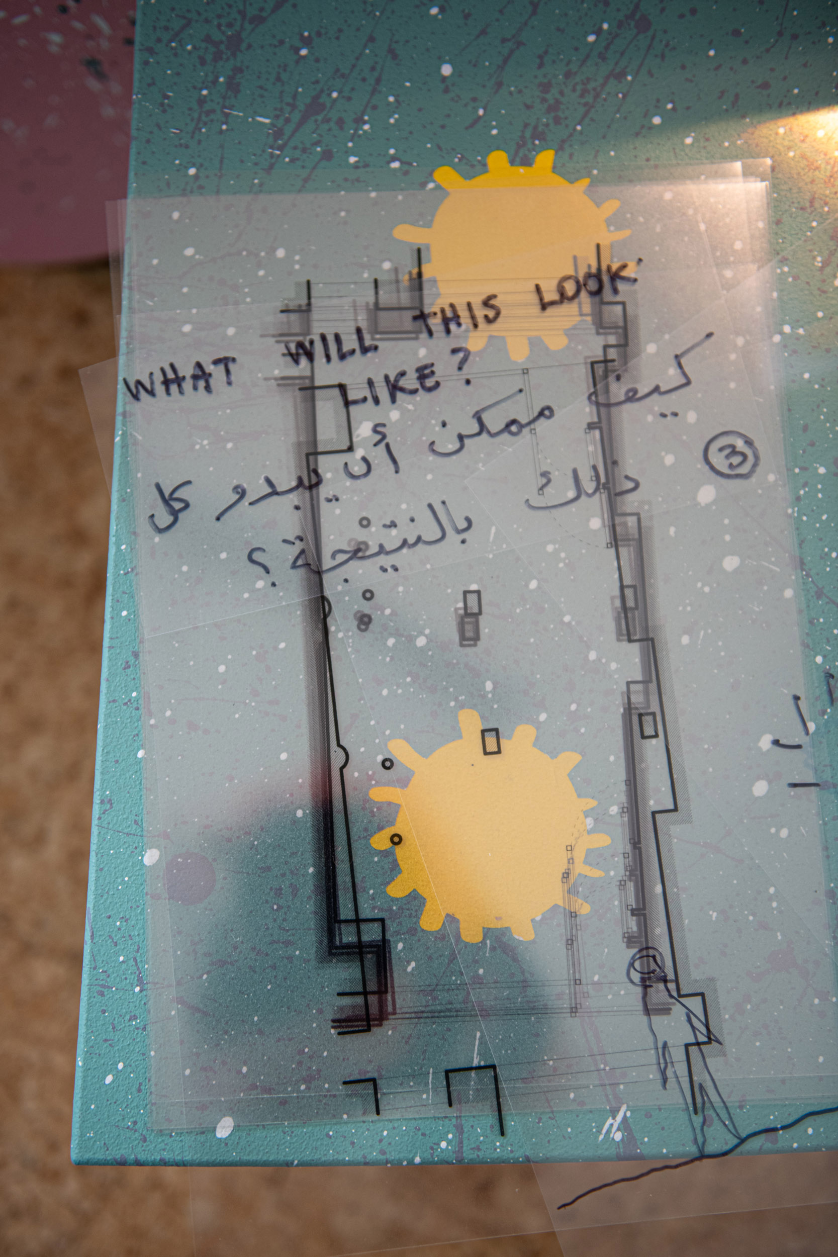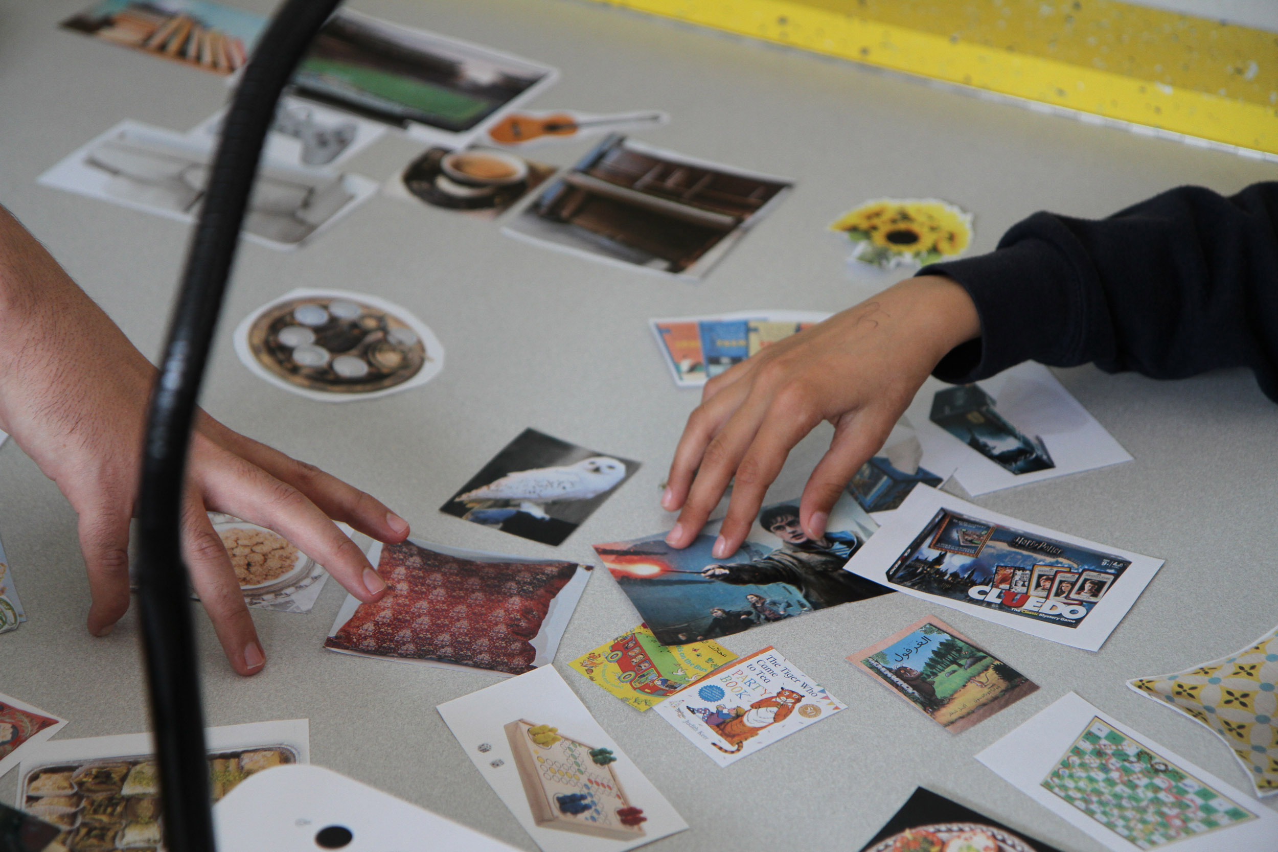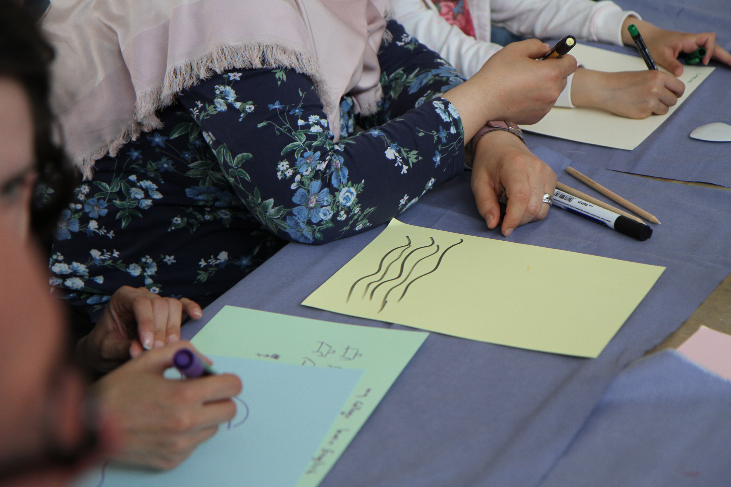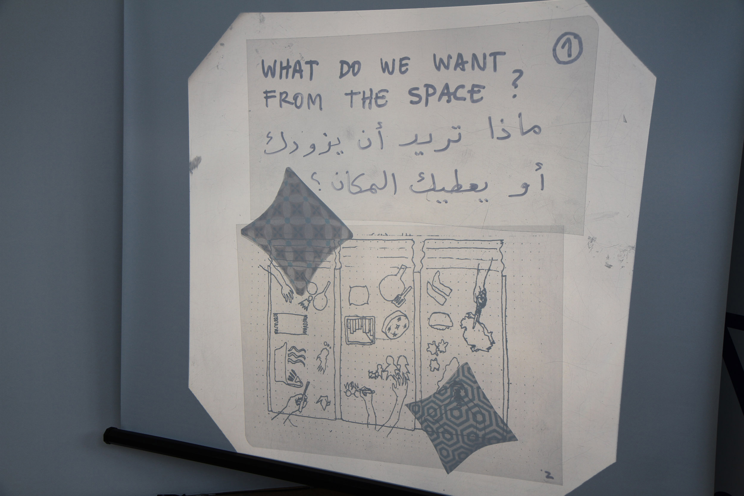 To enable participants to engage on their own terms, each activity allowed for a range of roles, from active to supportive to observational. We provided explanations and demonstrations of each activity and made ourselves available to facilitate, devising gentle steps to feel confident to participate. Participants were invited to sketch drawings, to compose scenes and to enact spatial settings, or they could choose to direct facilitators to communicate their ideas or to observe the activity instead. An Arabic translator was at hand through the workshop to support participants.