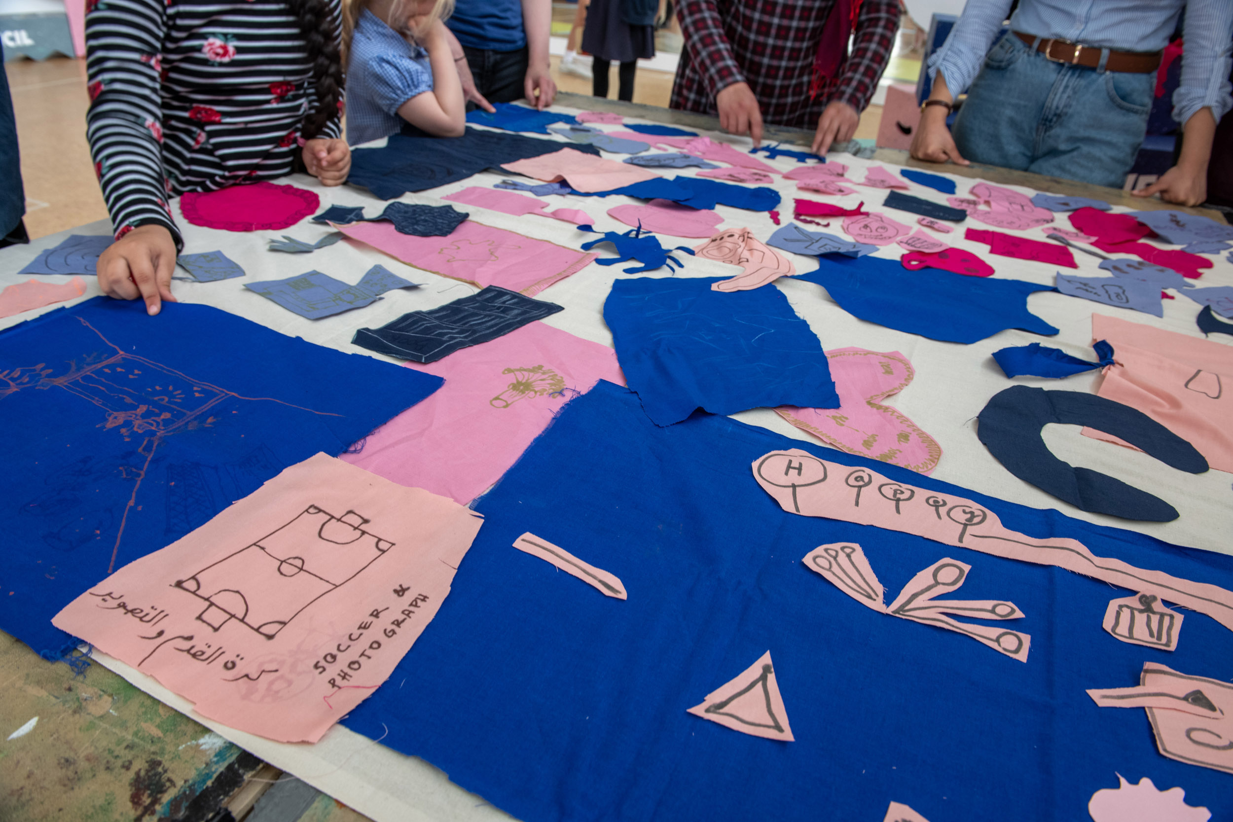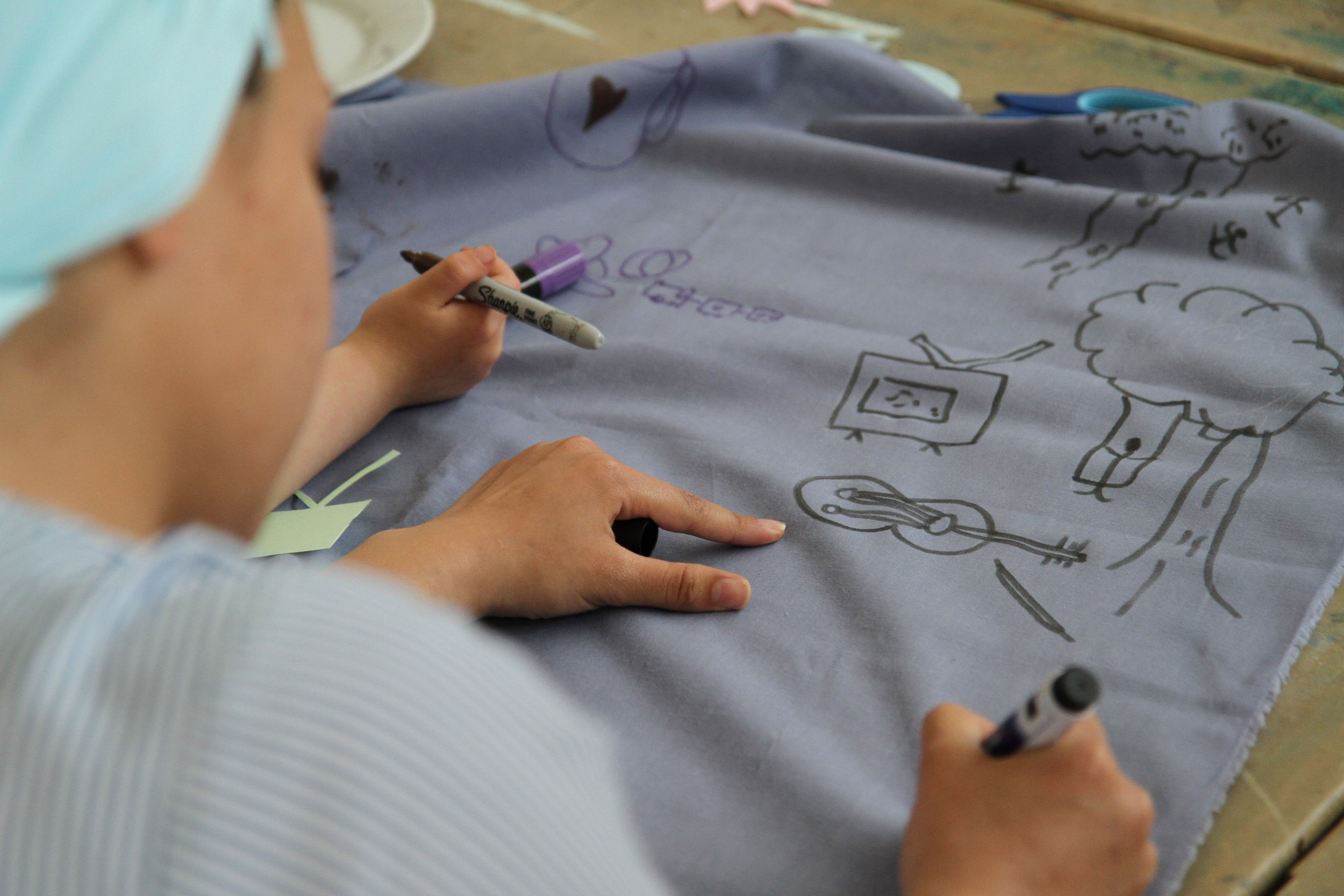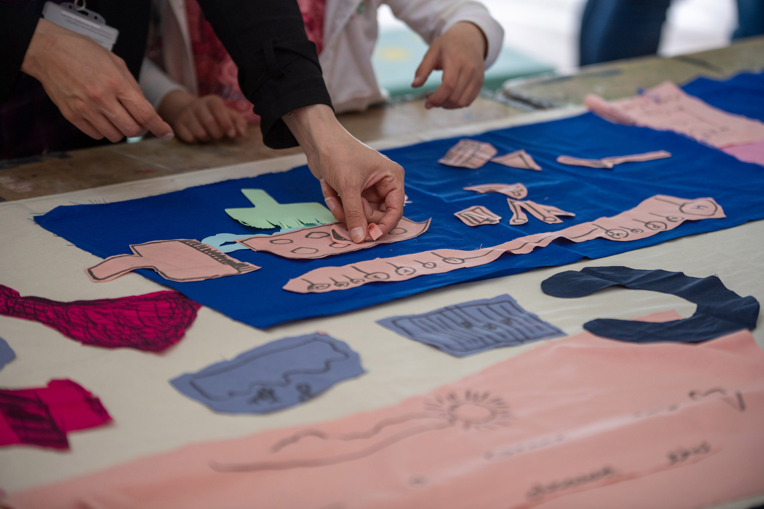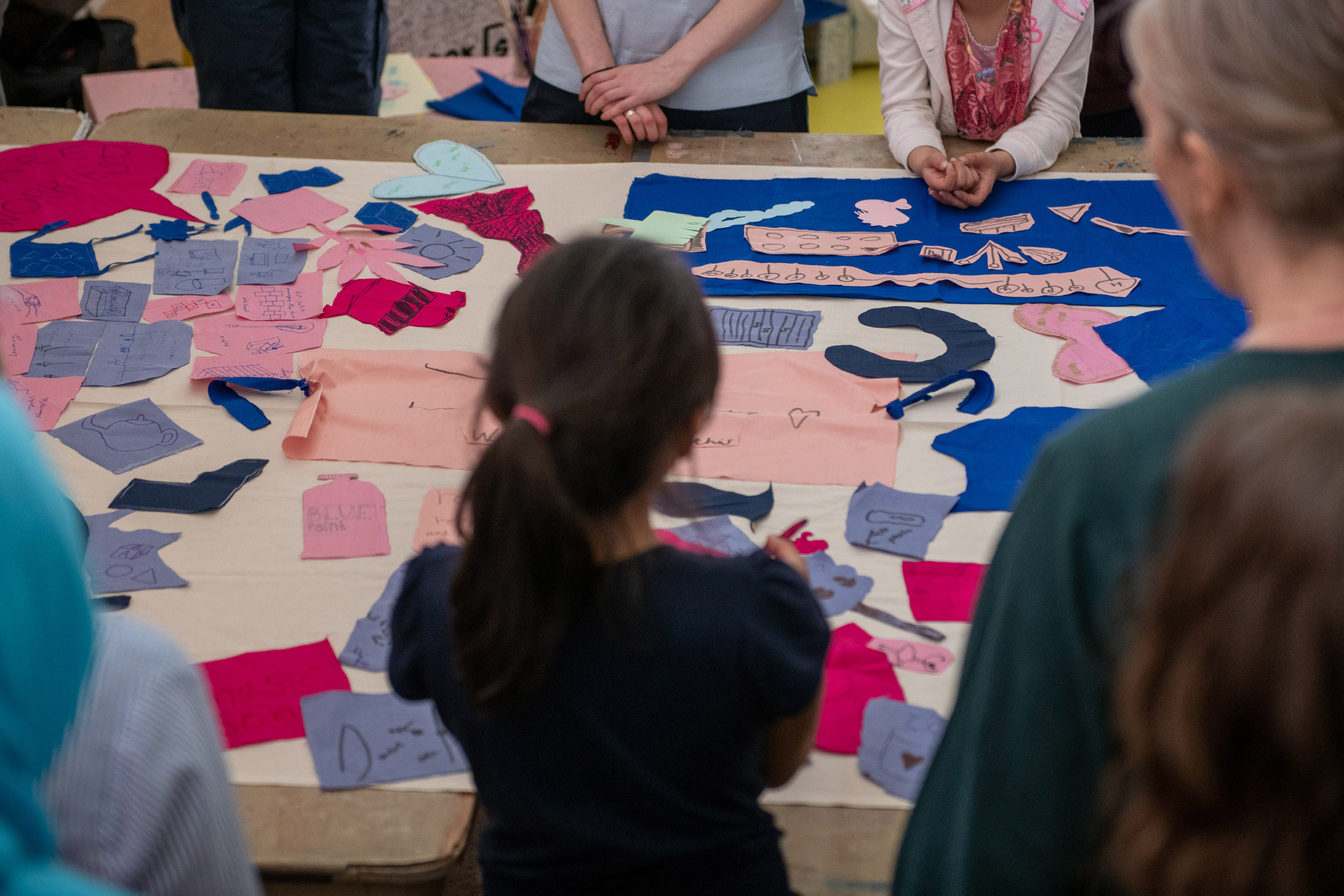 We invite you to join us at the table. The first question we would like to answer together is what do we want from the space? On this table are sheets of blue fabric. We would like you to draw ideas of what you want from the space with shapes related to those ideas. We can help you draw but we encourage you to be imaginative. After you have finished, we will cut out the fabric and on the back we will write the idea so we can remember what the shape represents.