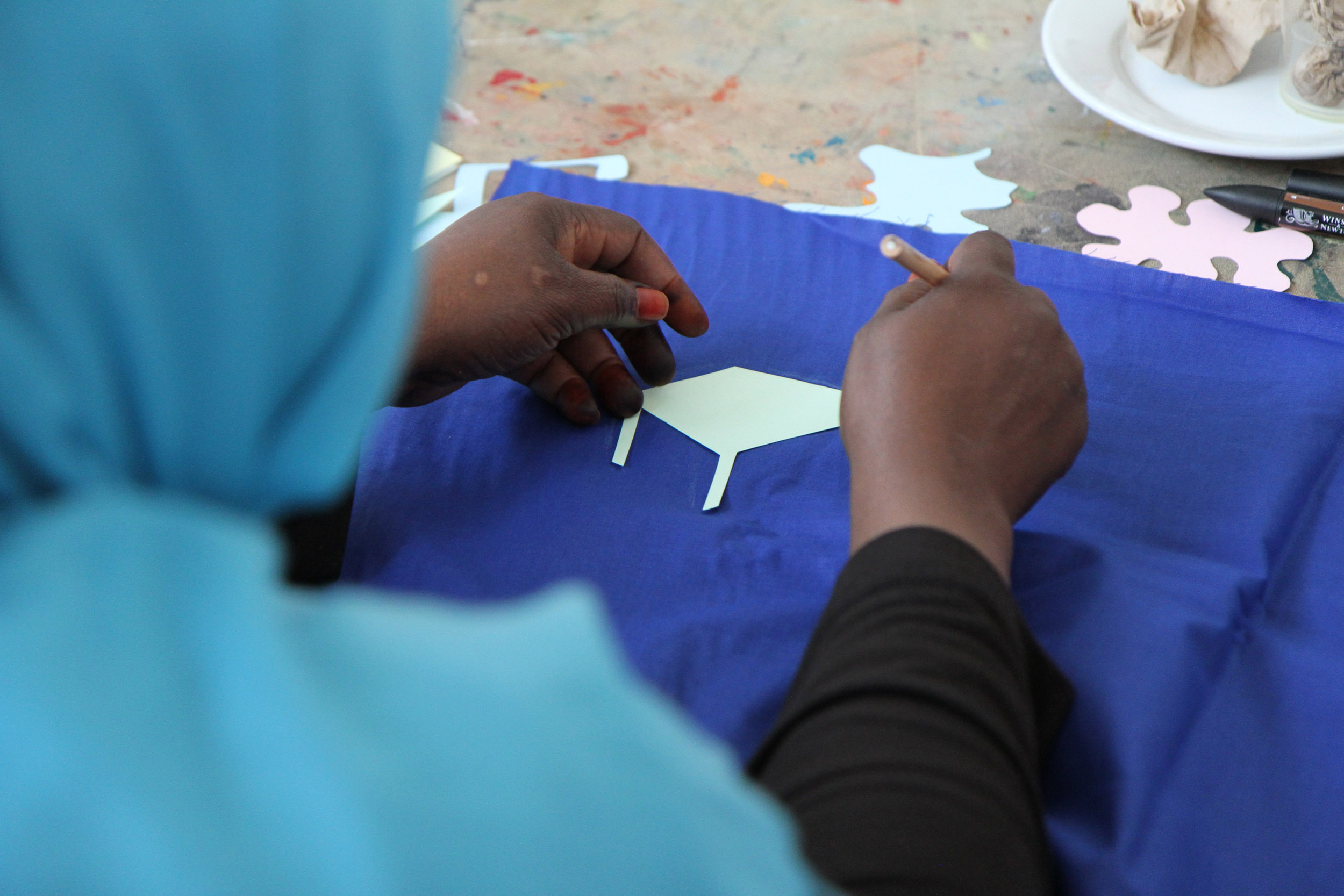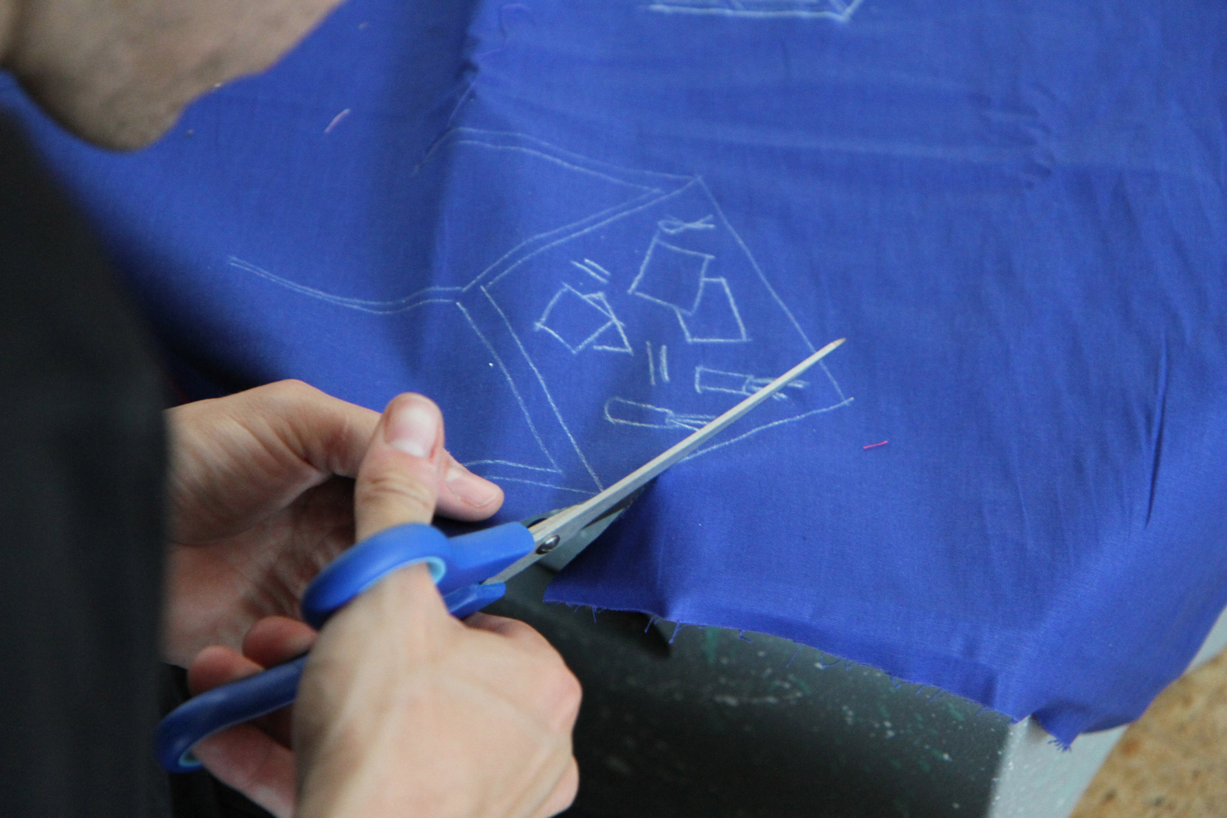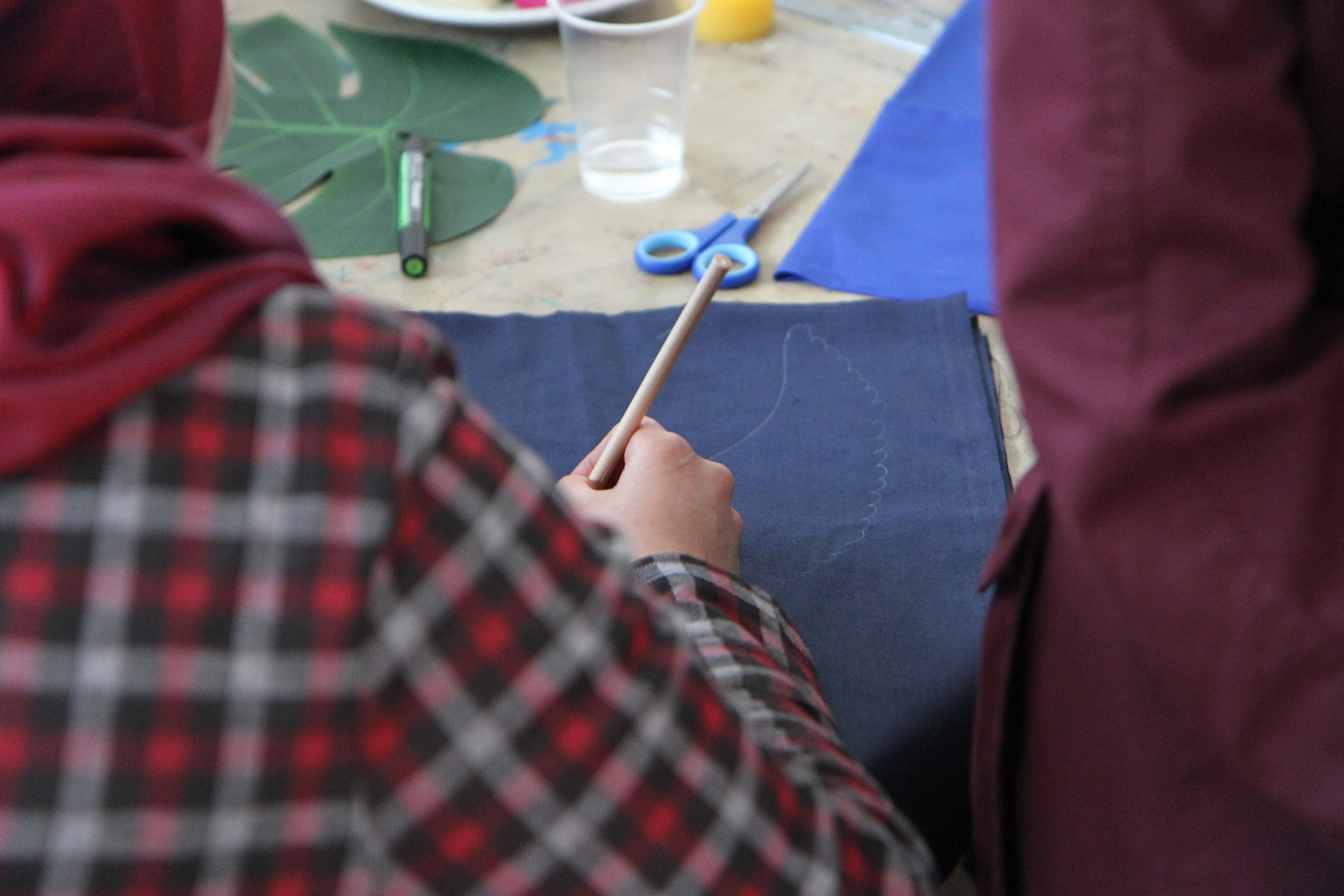 We invite you to join us at the table. The first question we would like to answer together is what do we want from the space? On this table are sheets of blue fabric. We would like you to draw ideas of what you want from the space with shapes related to those ideas. We can help you draw but we encourage you to be imaginative. After you have finished, we will cut out the fabric and on the back we will write the idea so we can remember what the shape represents.