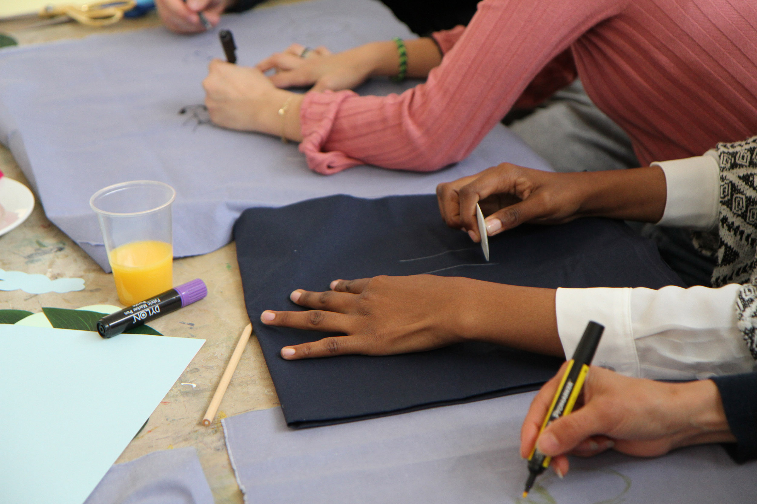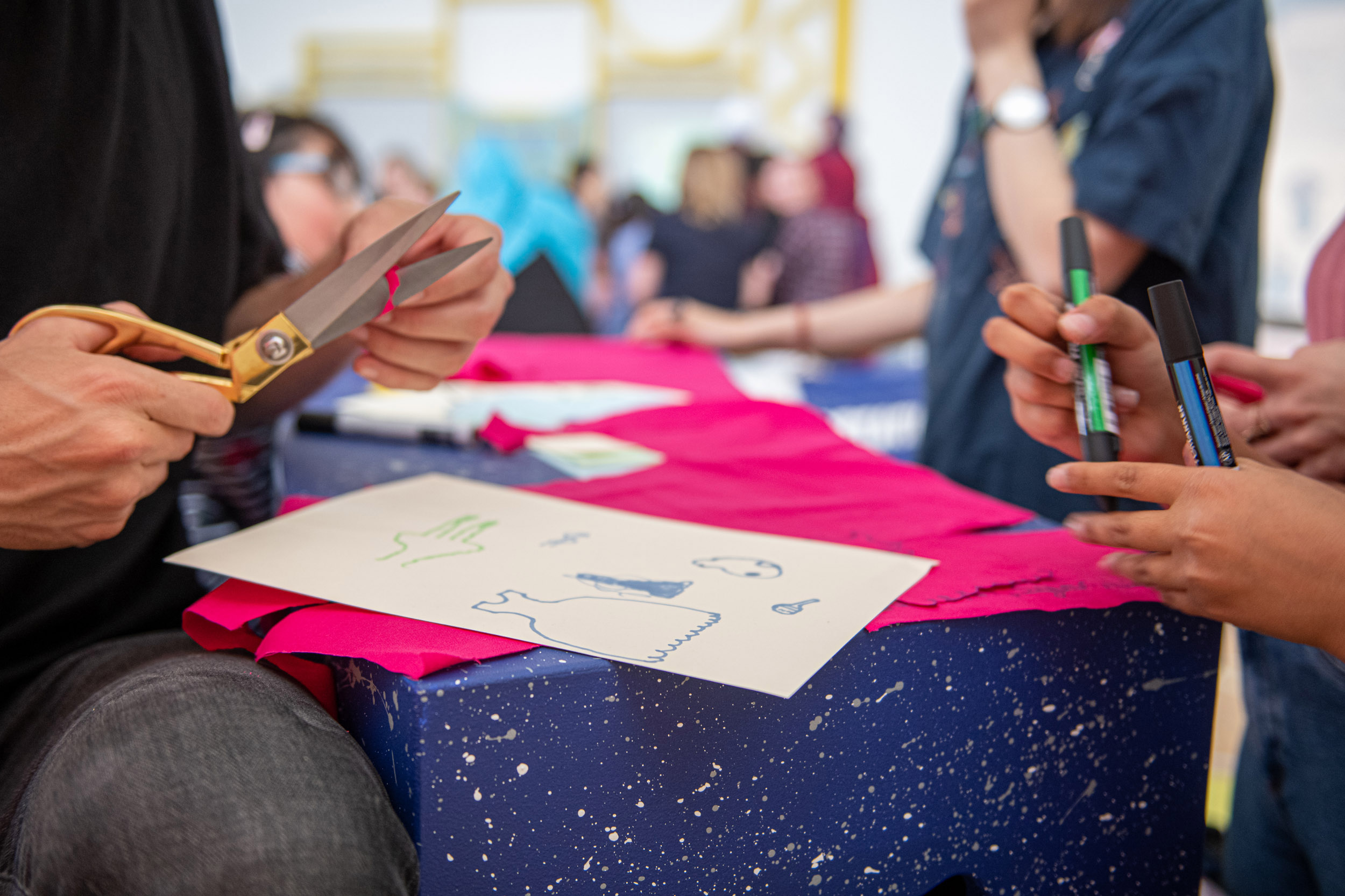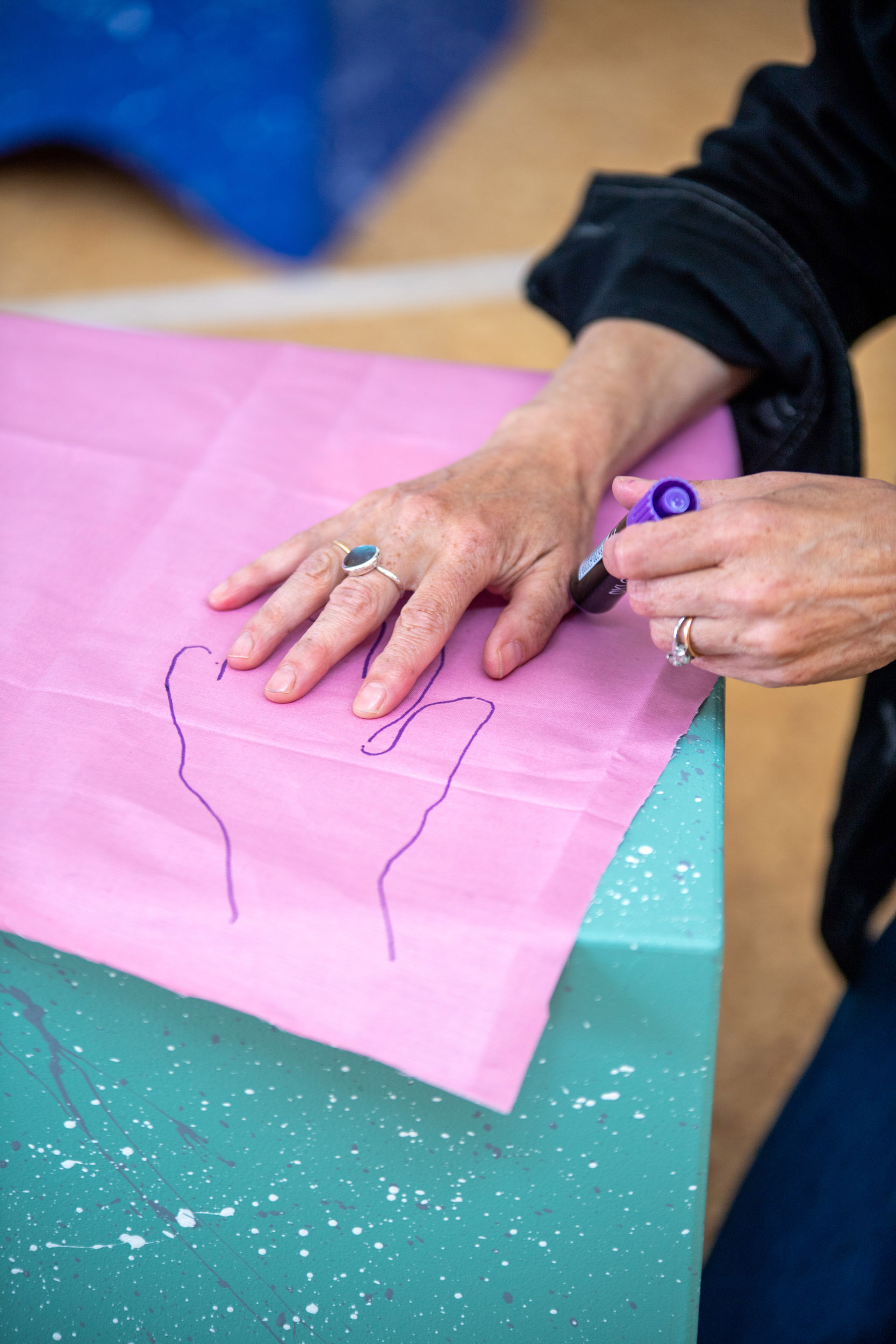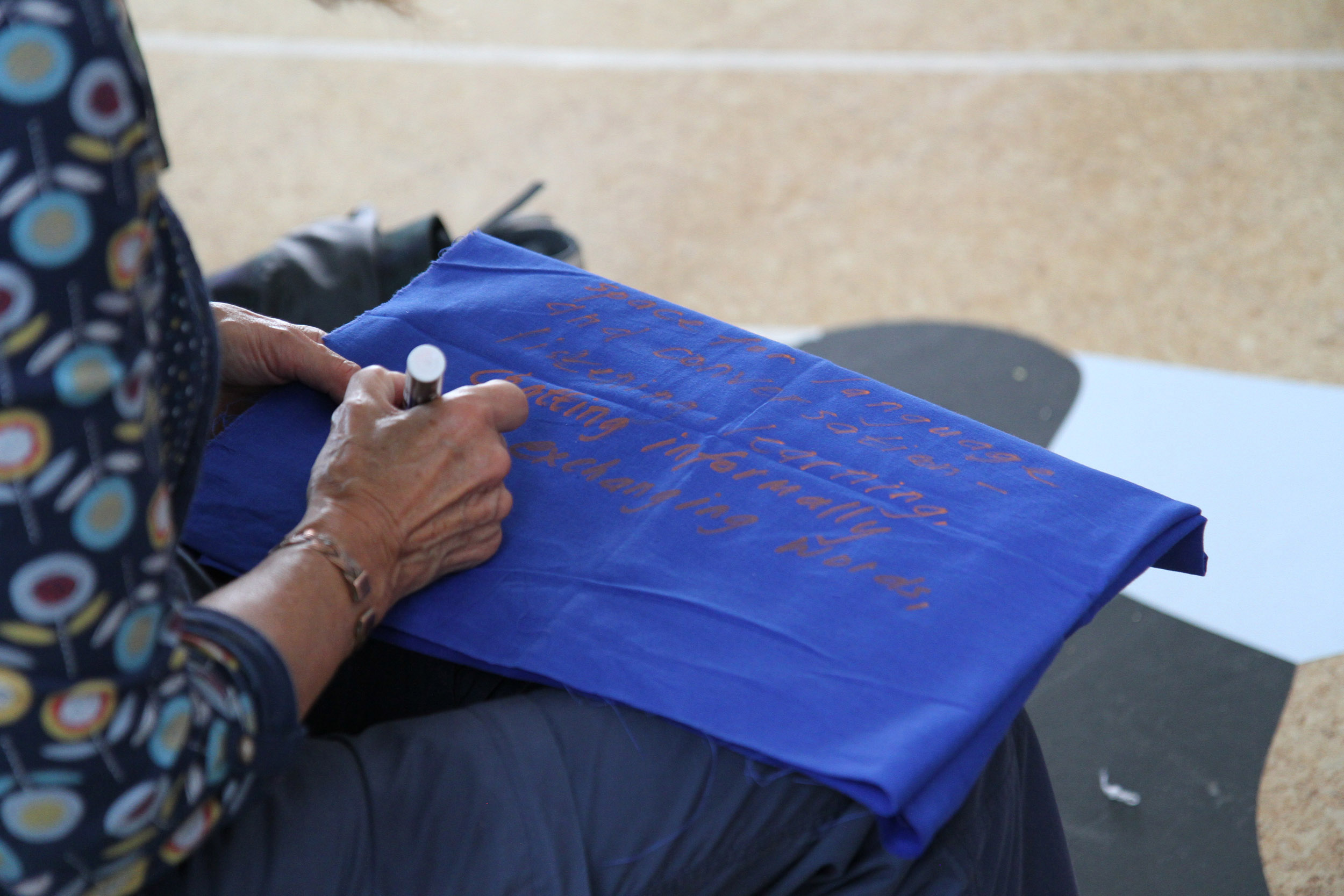 We invite you to join us at the table. The first question we would like to answer together is what do we want from the space? On this table are sheets of blue fabric. We would like you to draw ideas of what you want from the space with shapes related to those ideas. We can help you draw but we encourage you to be imaginative. After you have finished, we will cut out the fabric and on the back we will write the idea so we can remember what the shape represents.