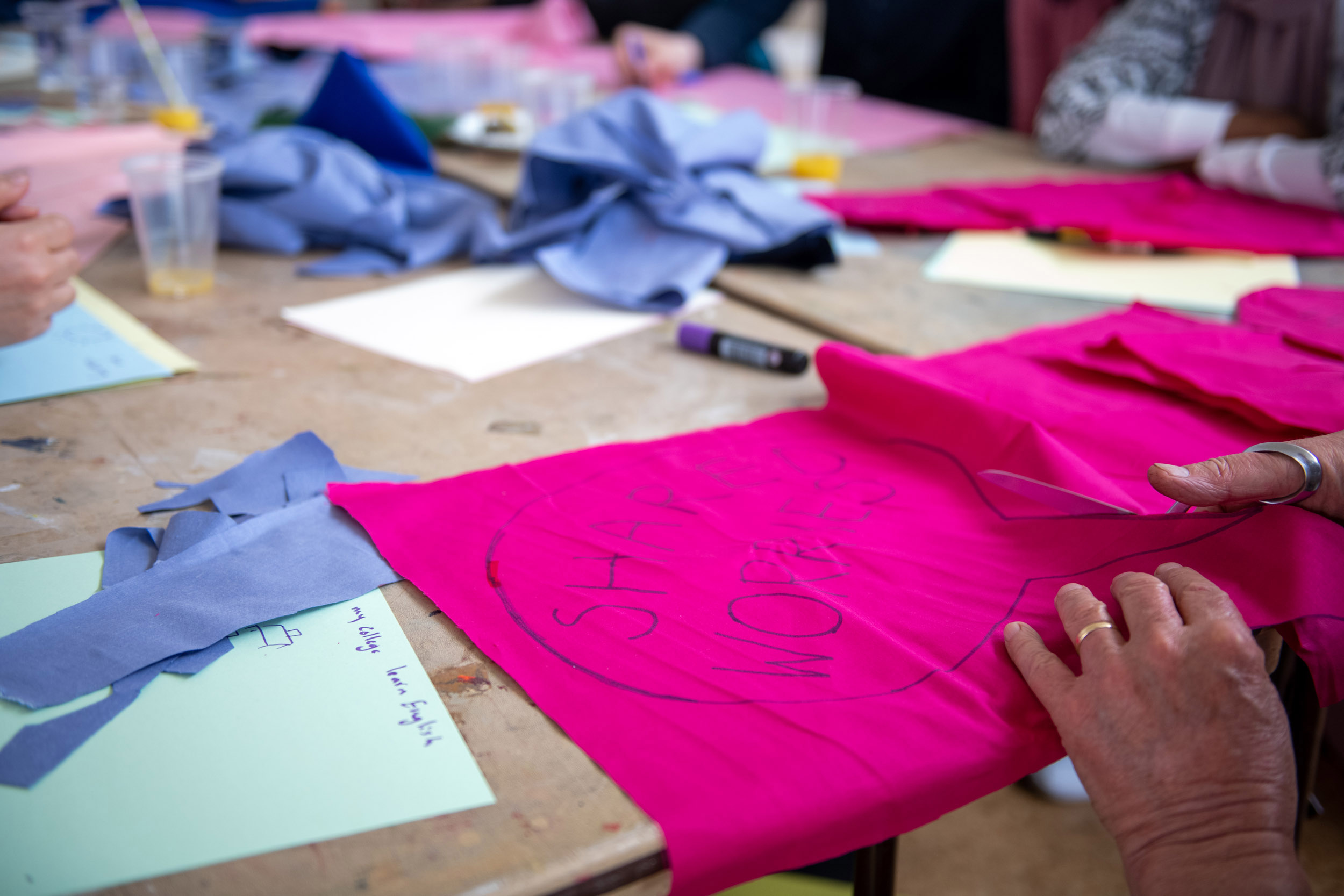 We will introduce each activity in turn, how we propose to facilitate it and the outputs it will generate. We will be present to help at any time. You are welcome to participate on your own terms – taking part, directing us or watching – and you can withdraw at any time. The work we make will be given to the Hastings and Rother Refugee Buddy Project. We will not record conversations. Photographs will be taken by a dedicated photographer. He will not take photos of your faces but of your hands drawing and making. If you do not wish to be photographed at all, please collect a lanyard.