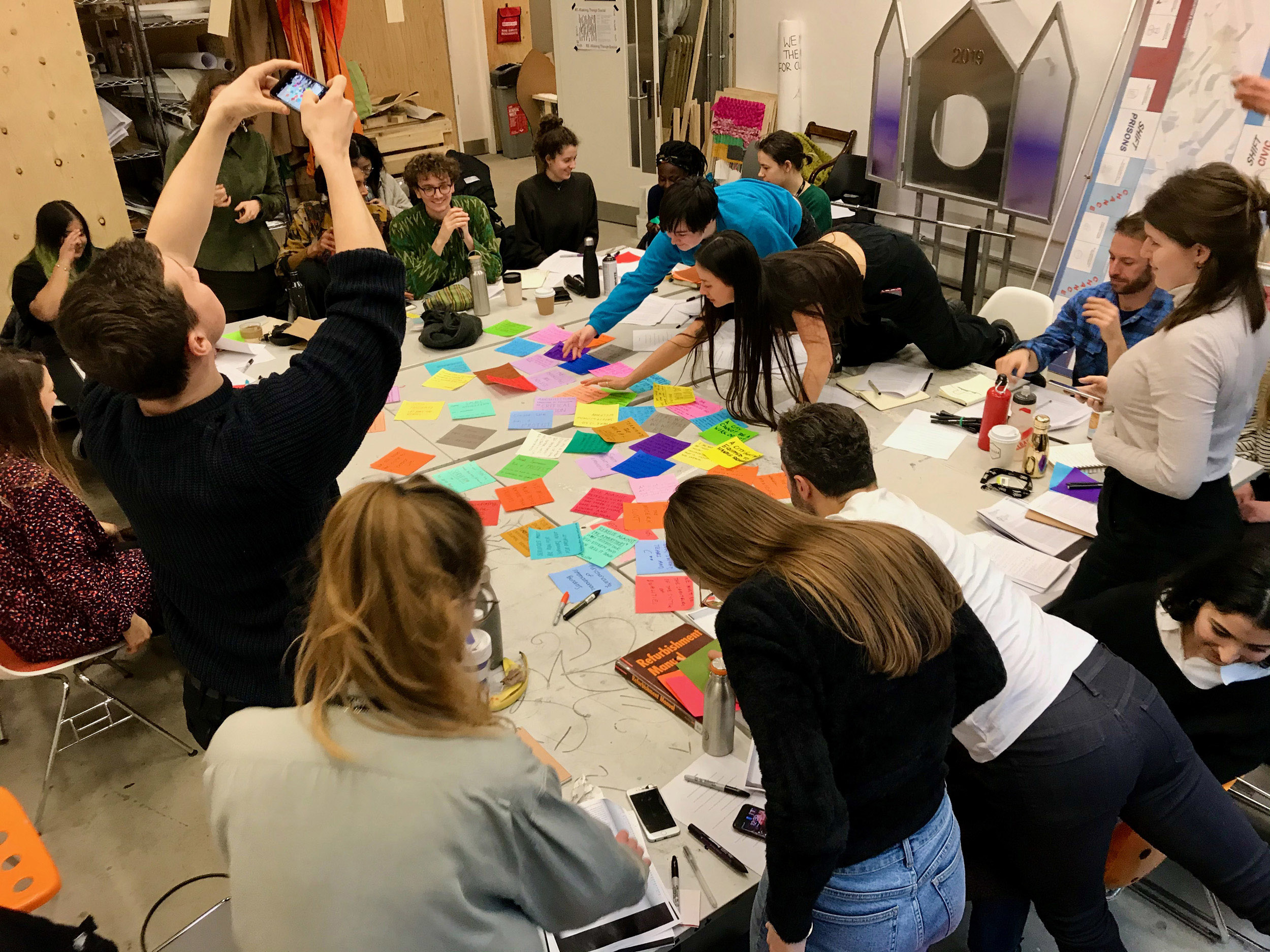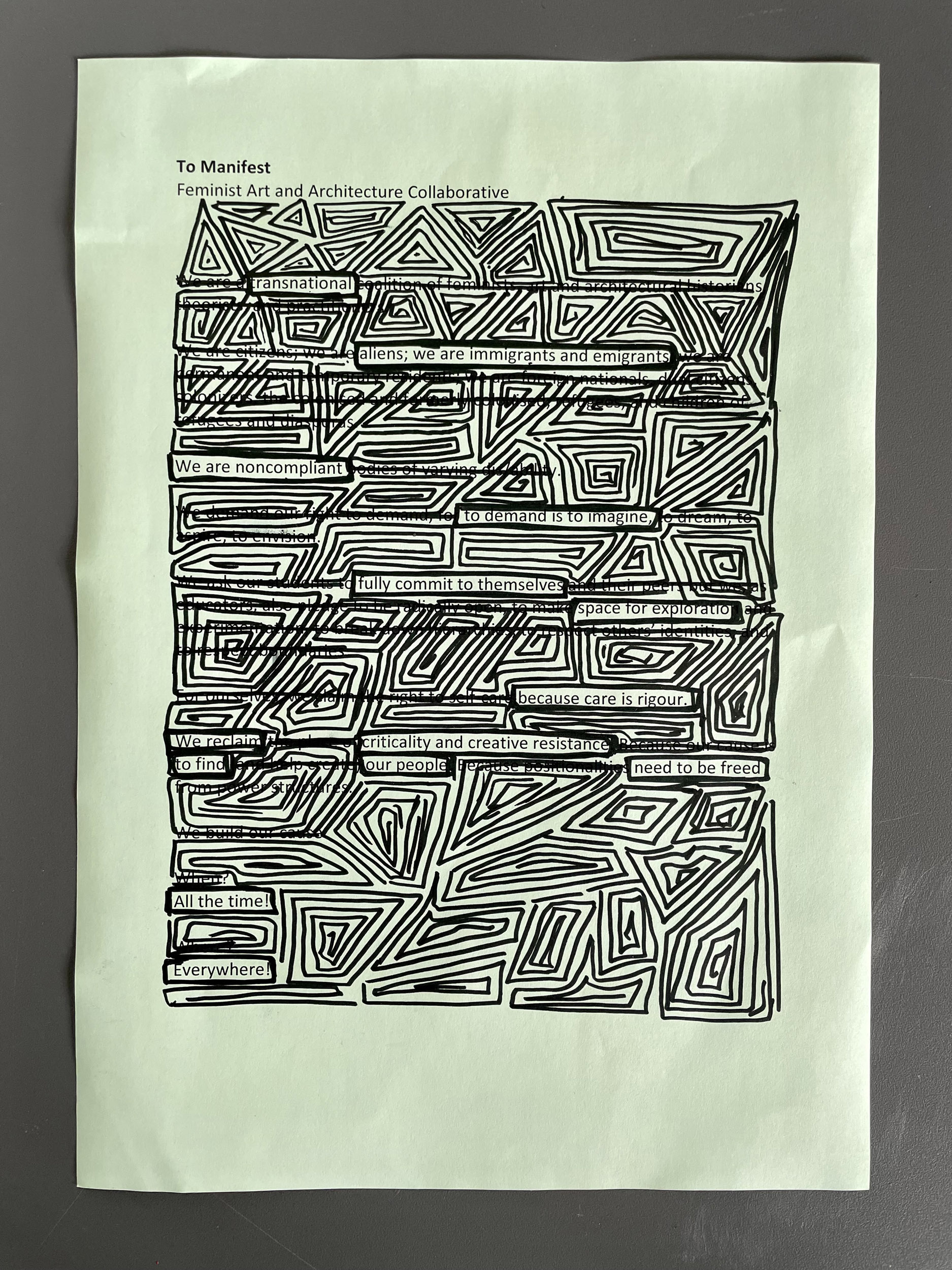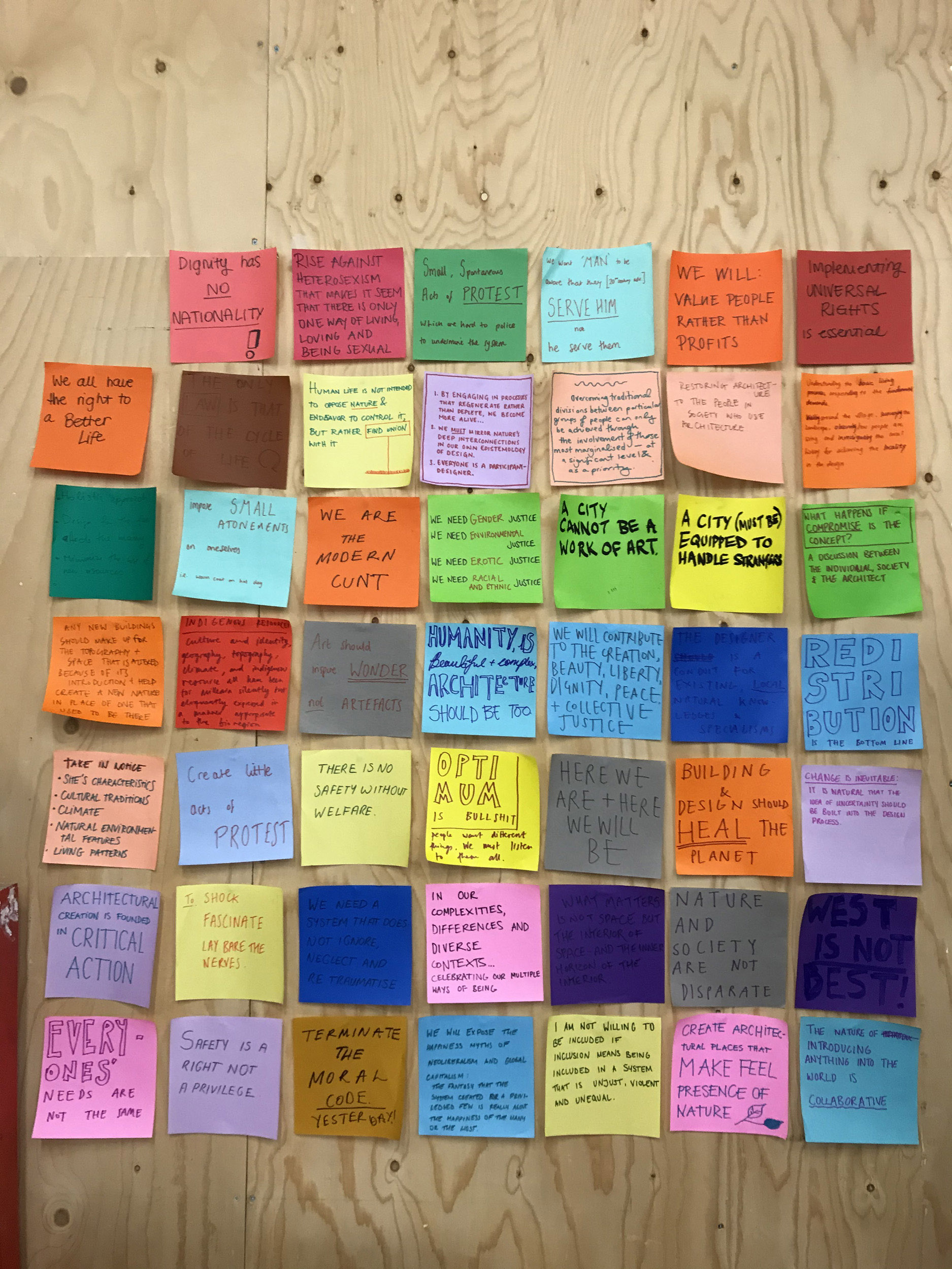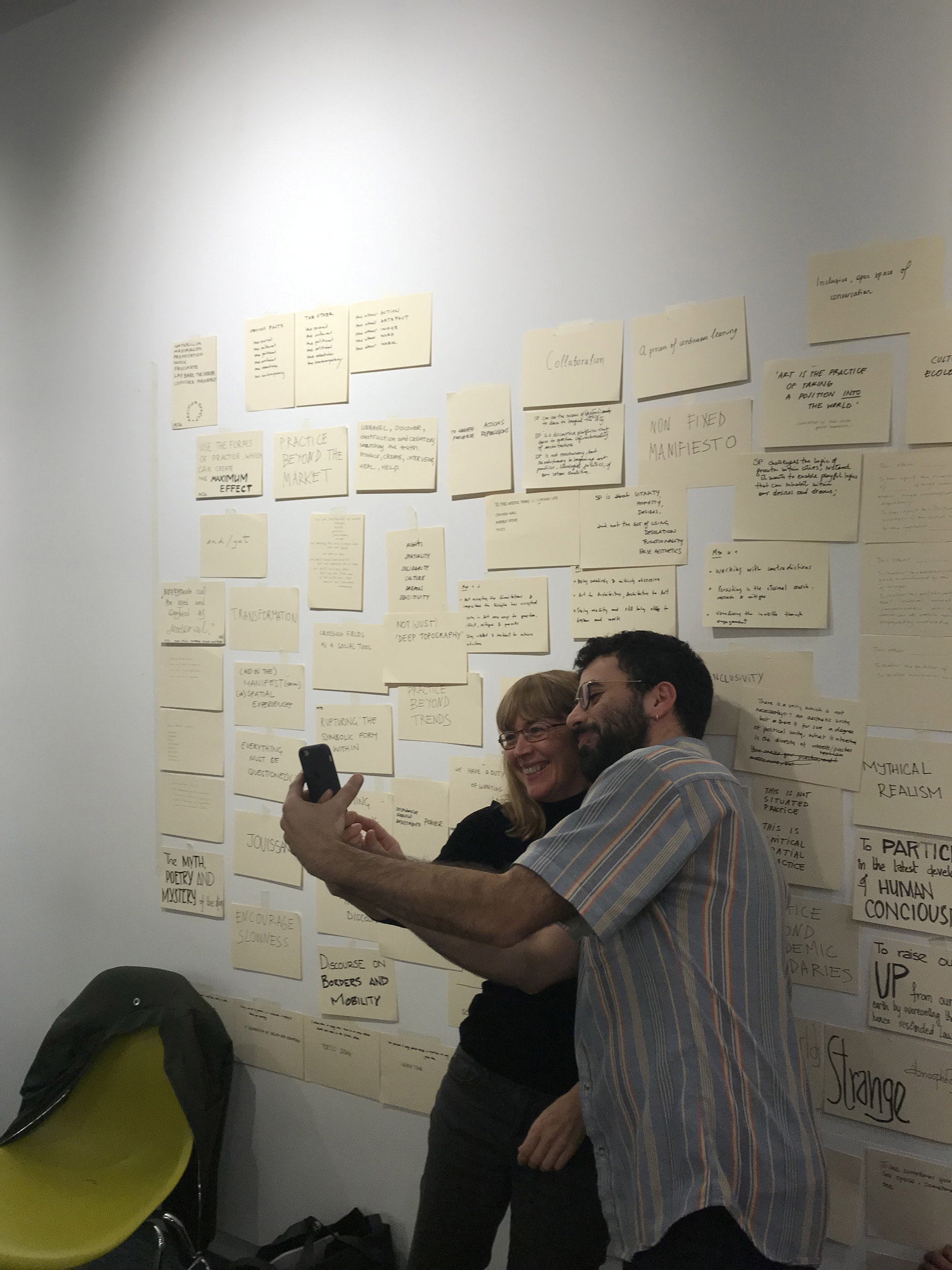 Taking inspiration from art collective Freee, we deliberate whether we agree with each word, phrase and point, considering which of these we wish to include or amend in our own response. The work of Freee art collective, comprising Dave Beech, Andy Hewitt, and Mel Jordan, uses manifestos, sculptural kiosks, spoken word choirs, and the ‘bodily endorsement of slogan’ in an attempt to form community forged in dialogue through the declaration of agreement and disagreement, seeking to reinvigorate manifesto writing as a practical tool for collective political engagement (Jordan, Beech & Hewitt, 2015). The act of drafting a manifesto involves both a relational act of working through as authors to respond to the principles and practices set out by others in relation to contemporary forces, and a reflexive relay of working towards that which not only reflects but projects as a directive for future acts (Caws, 2015). As we work through and towards, we move, reorder and rewrite notes across the wall and confront positionality which, as anthropologist Soyini Madison summarises, 'forces us to acknowledge our own power, privilege, and biases… When we turn back on ourselves, we examine our intentions, our methods, and our possible effects’ (Madison, 2005).