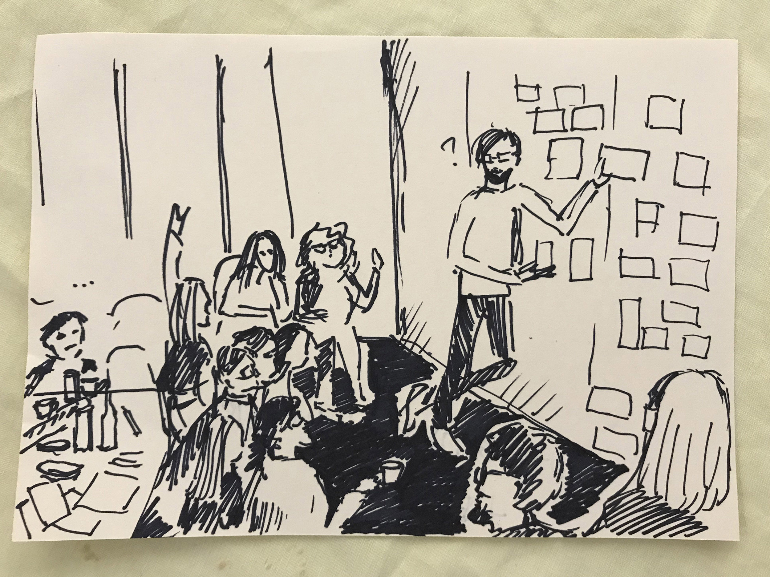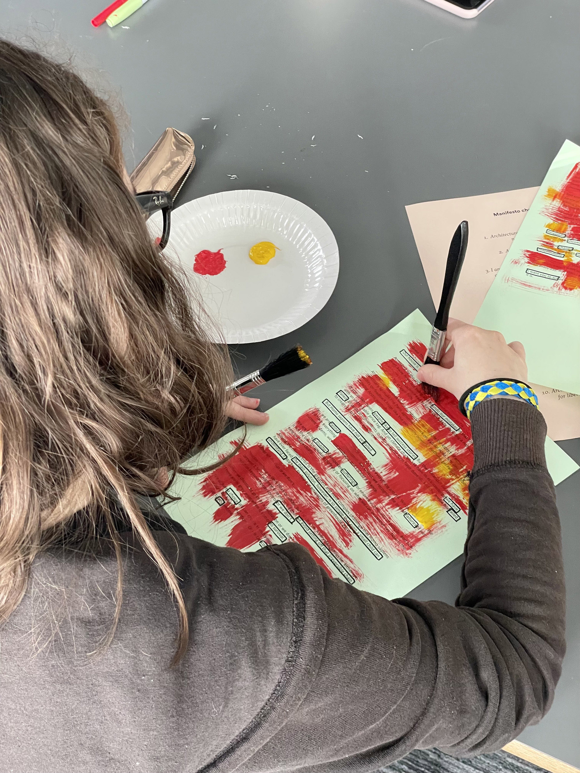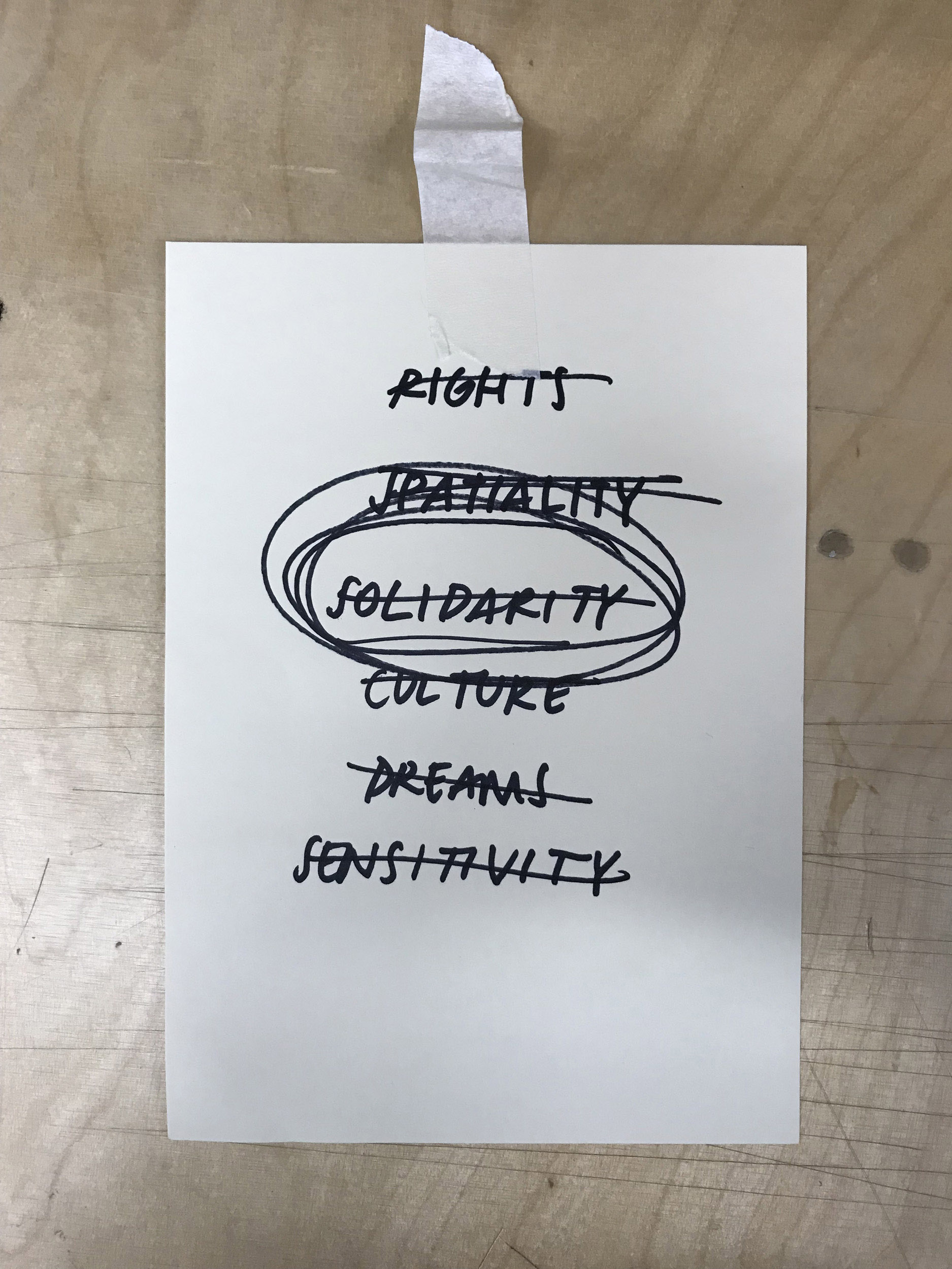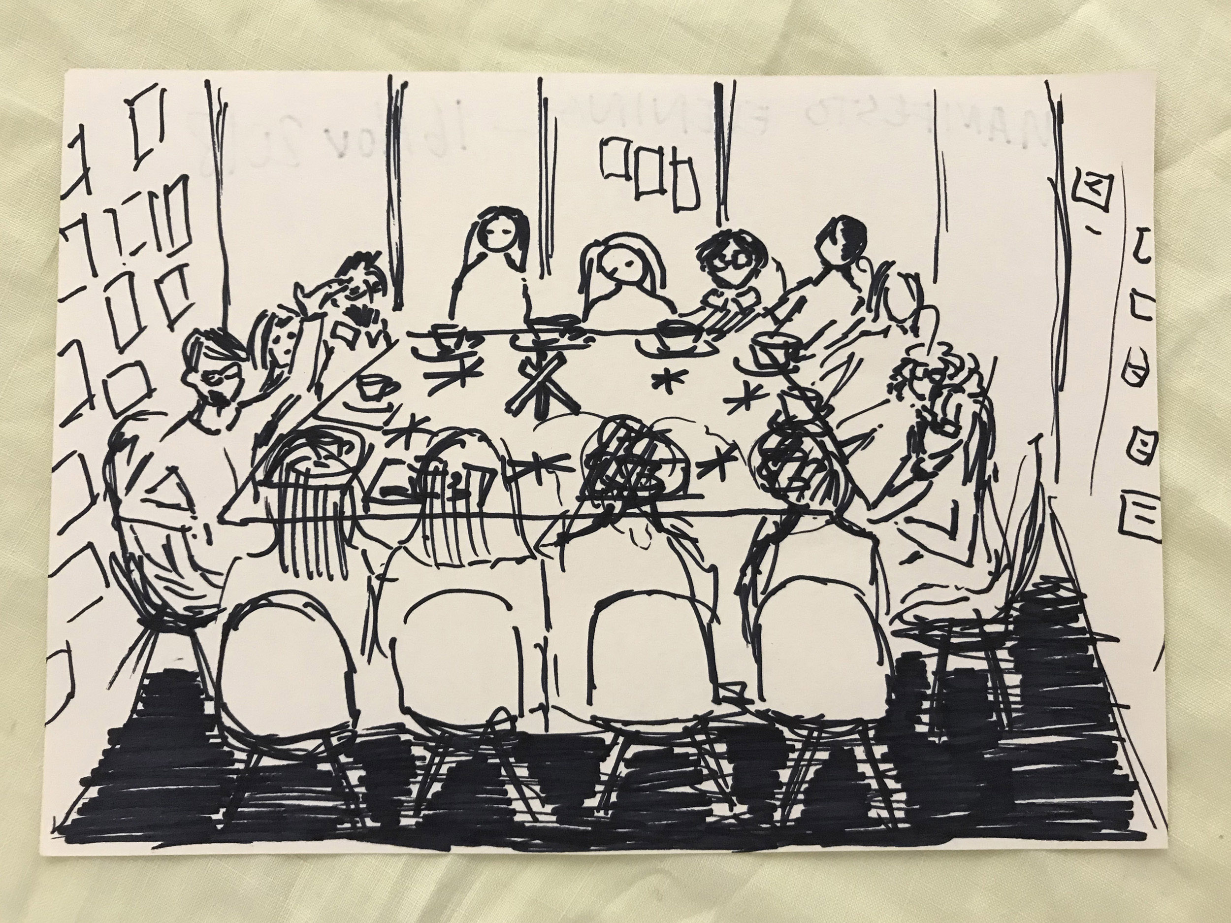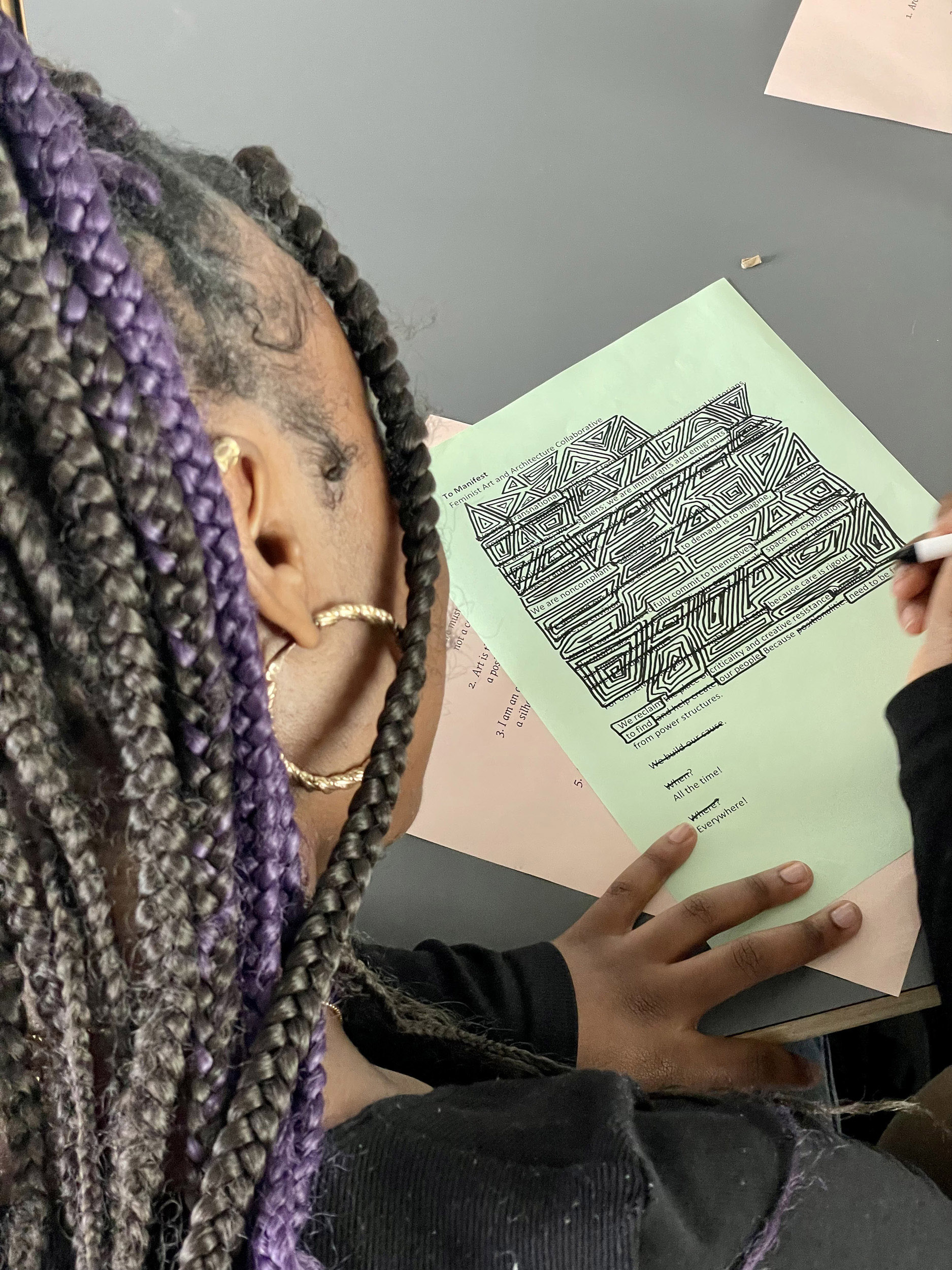 Taking inspiration from art collective Freee, we deliberate whether we agree with each word, phrase and point, considering which of these we wish to include or amend in our own response. The work of Freee art collective, comprising Dave Beech, Andy Hewitt, and Mel Jordan, uses manifestos, sculptural kiosks, spoken word choirs, and the ‘bodily endorsement of slogan’ in an attempt to form community forged in dialogue through the declaration of agreement and disagreement, seeking to reinvigorate manifesto writing as a practical tool for collective political engagement (Jordan, Beech & Hewitt, 2015). The act of drafting a manifesto involves both a relational act of working through as authors to respond to the principles and practices set out by others in relation to contemporary forces, and a reflexive relay of working towards that which not only reflects but projects as a directive for future acts (Caws, 2015). As we work through and towards, we move, reorder and rewrite notes across the wall and confront positionality which, as anthropologist Soyini Madison summarises, 'forces us to acknowledge our own power, privilege, and biases… When we turn back on ourselves, we examine our intentions, our methods, and our possible effects’ (Madison, 2005).