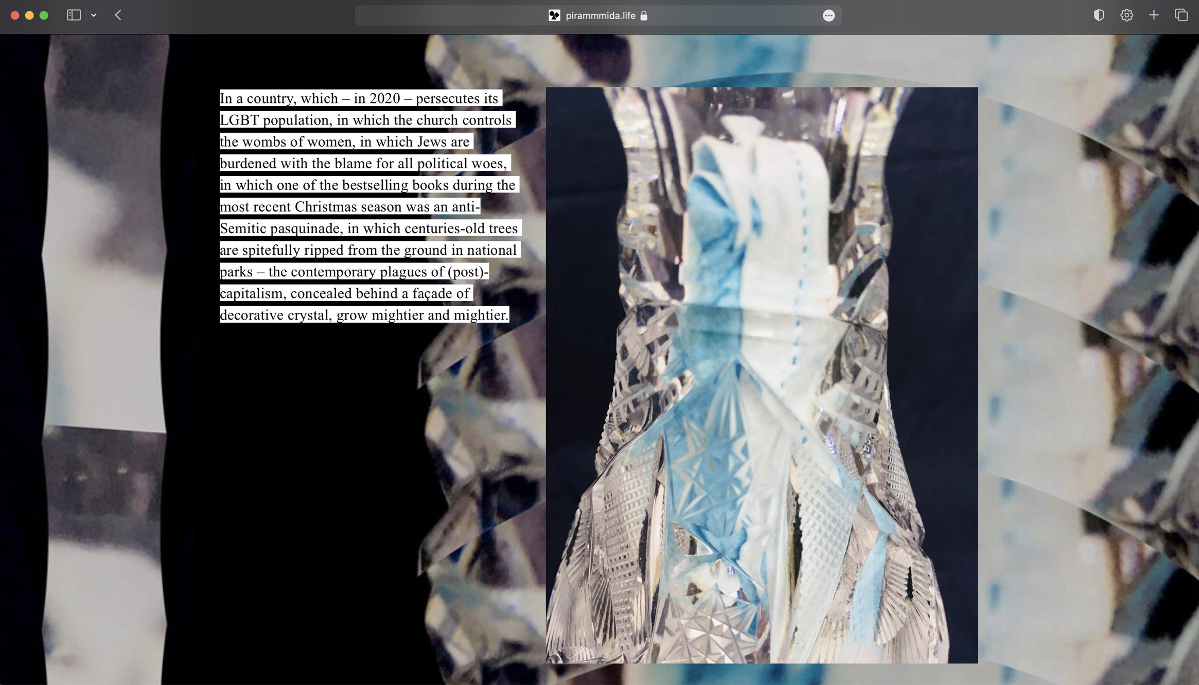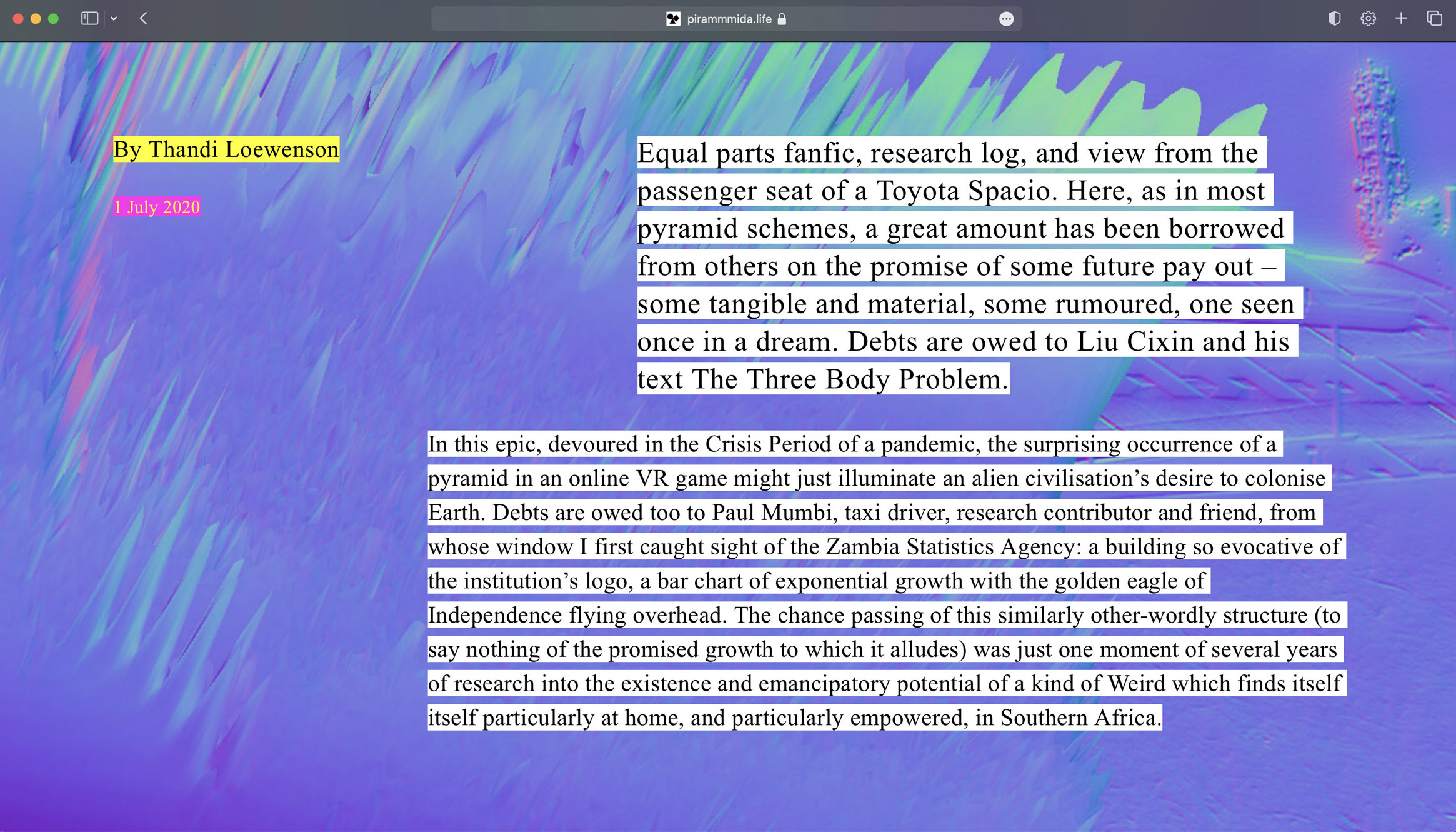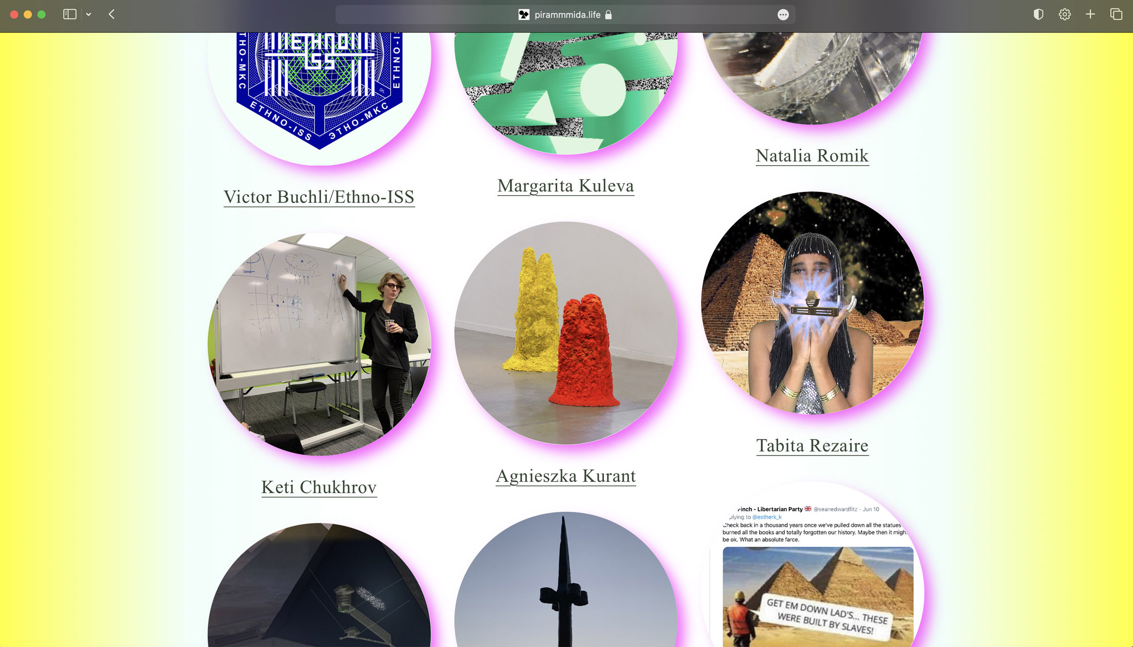 Rather than postpone the installation in the outbreak of COVID-19, it transposed into Cyber-PiraMMMida, an online platform constructed around three conceptual cornerstones: Power, Planet and Plague. In this virtual space, contributors try to make sense of, subvert and speculate upon the verticalities, horizontalities, perpendicularities and other political geometries (real and fake), which constitute the contours of our present-day pyramids in a time of pandemic, planetary meltdown and fascism resurgent. The projects, ideas and artworks presented collectively enquire: can speculation be repurposed in the direction of self-cancellation, critique and reaffirmation of the possible, desirable change of political and economic conditions of precarity and cancelled futures?