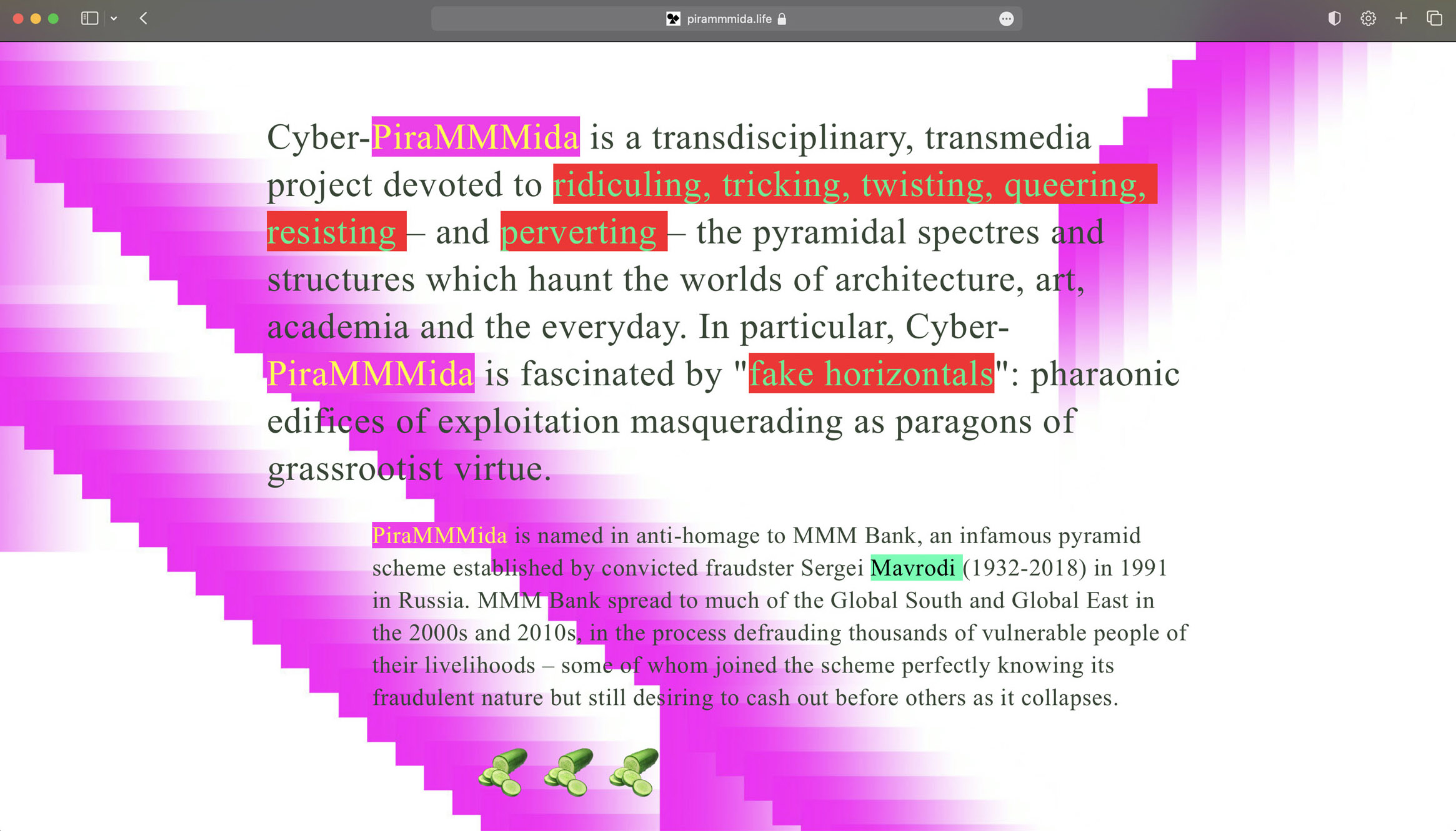 PiraMMMida is a transdisciplinary, transmedia project devoted to ridiculing, tricking, twisting, queering, resisting – and perverting – the pyramidal spectres and structures which haunt the worlds of architecture, art, academia and the everyday. In particular, PiraMMMida is fascinated by "fake horizontals": pharaonic edifices of exploitation masquerading as paragons of grassrootist virtue.