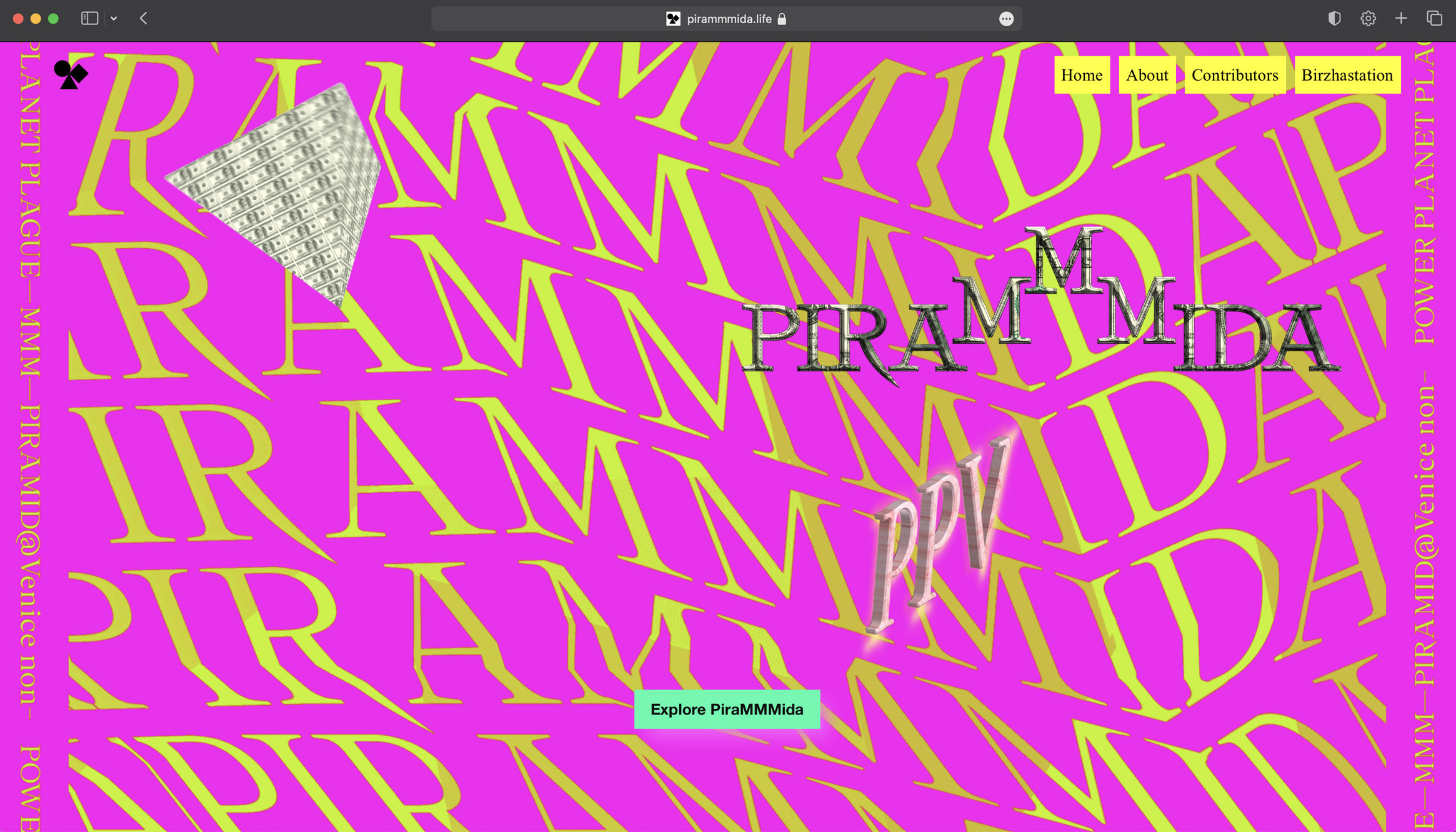 PiraMMMida is named in anti-homage to MMM Bank, an infamous pyramid scheme established by convicted fraudster Sergei Mavrodi (1932-2018) in 1991 in Russia. MMM Bank spread to much of the Global South and Global East in the 2000s and 2010s, in the process defrauding thousands of vulnerable people of their livelihoods – some of whom joined the scheme perfectly knowing its fraudulent nature but still desiring to cash out before others as it collapses
