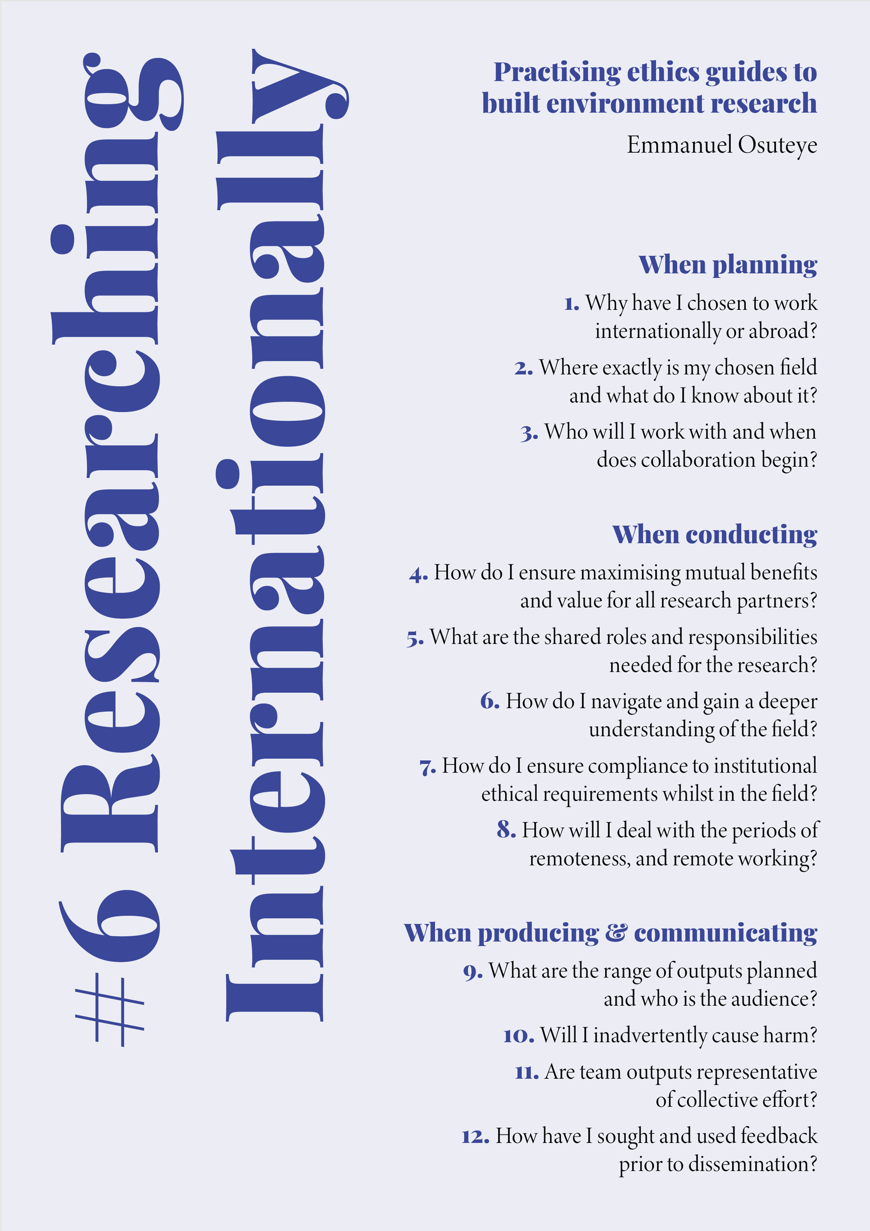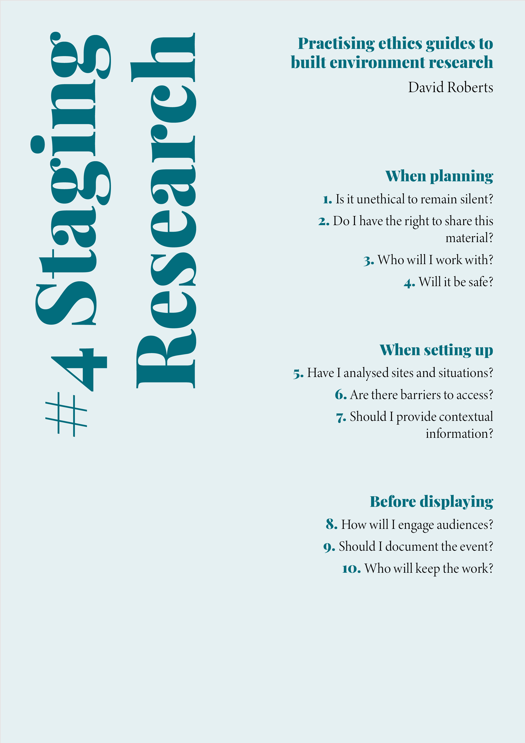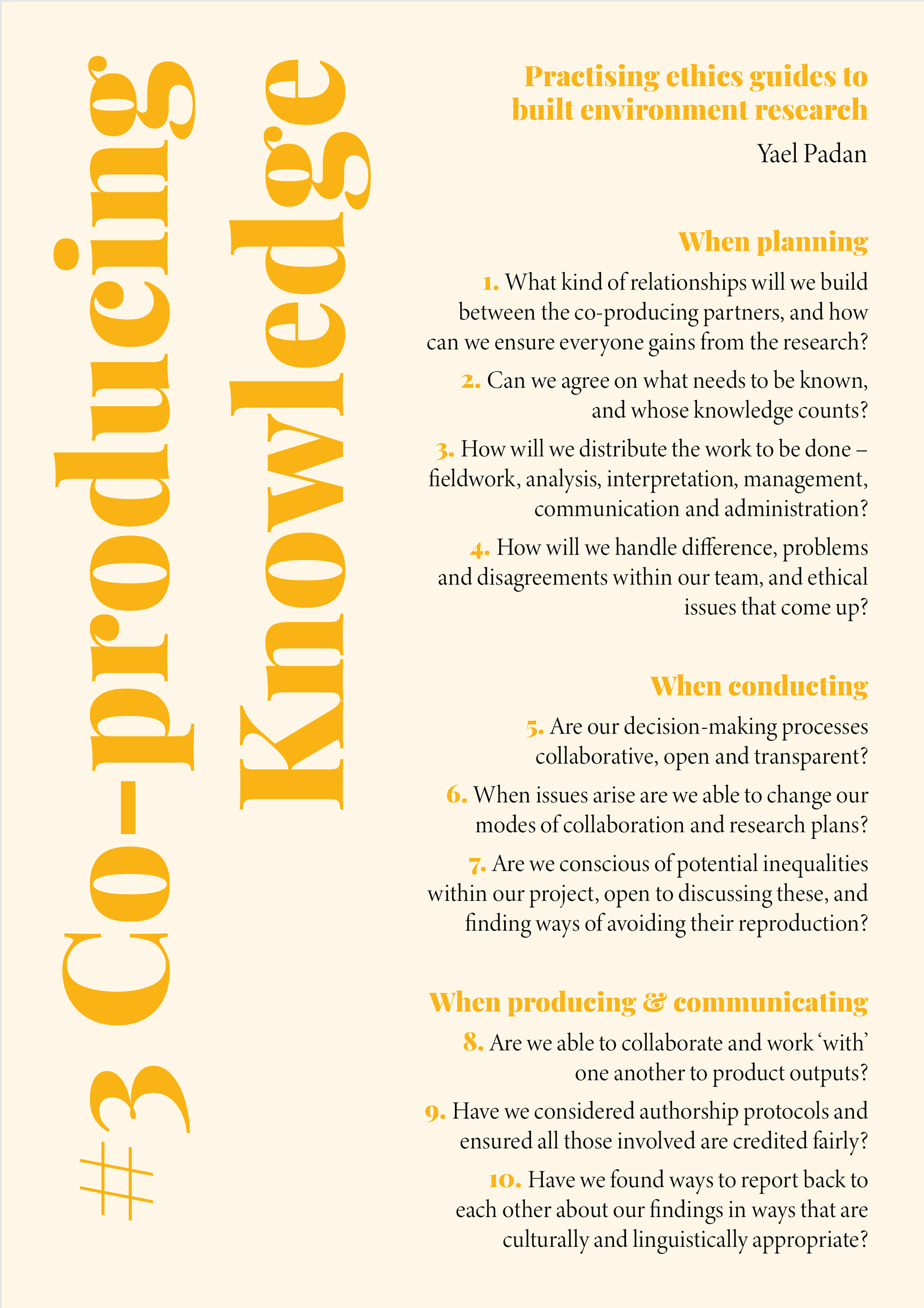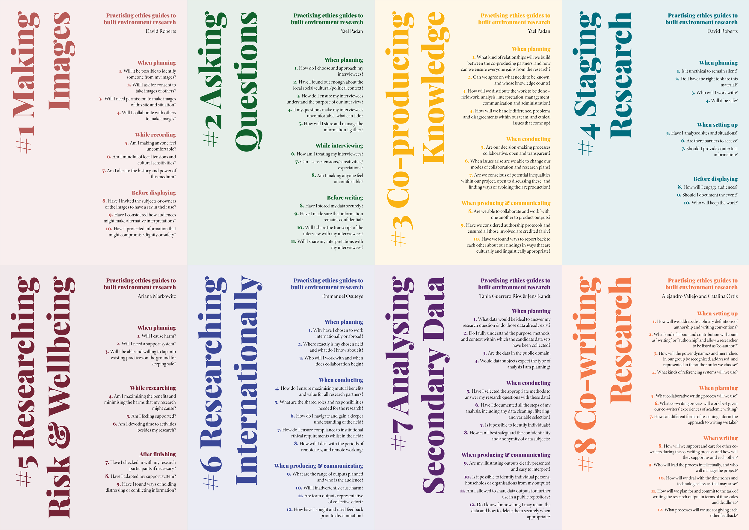 As our aim has been to help readers practise their research ethically, from these opening questions I devised the format and structure of the guidelines to follow the path of ethical issues as they might arise during the development of a research process — from planning and conducting research, to communicating and producing outcomes. Each guide opens with a series of guiding questions, acting as prompts to reflect on the potential ethical considerations which emerge throughout a project, before, during, and after research has been conducted. The guidelines proceed to expand on the dilemmas and possible courses of action suggested by reflecting on the questions, illuminating the different ethical concerns they raise, and recommending actions.