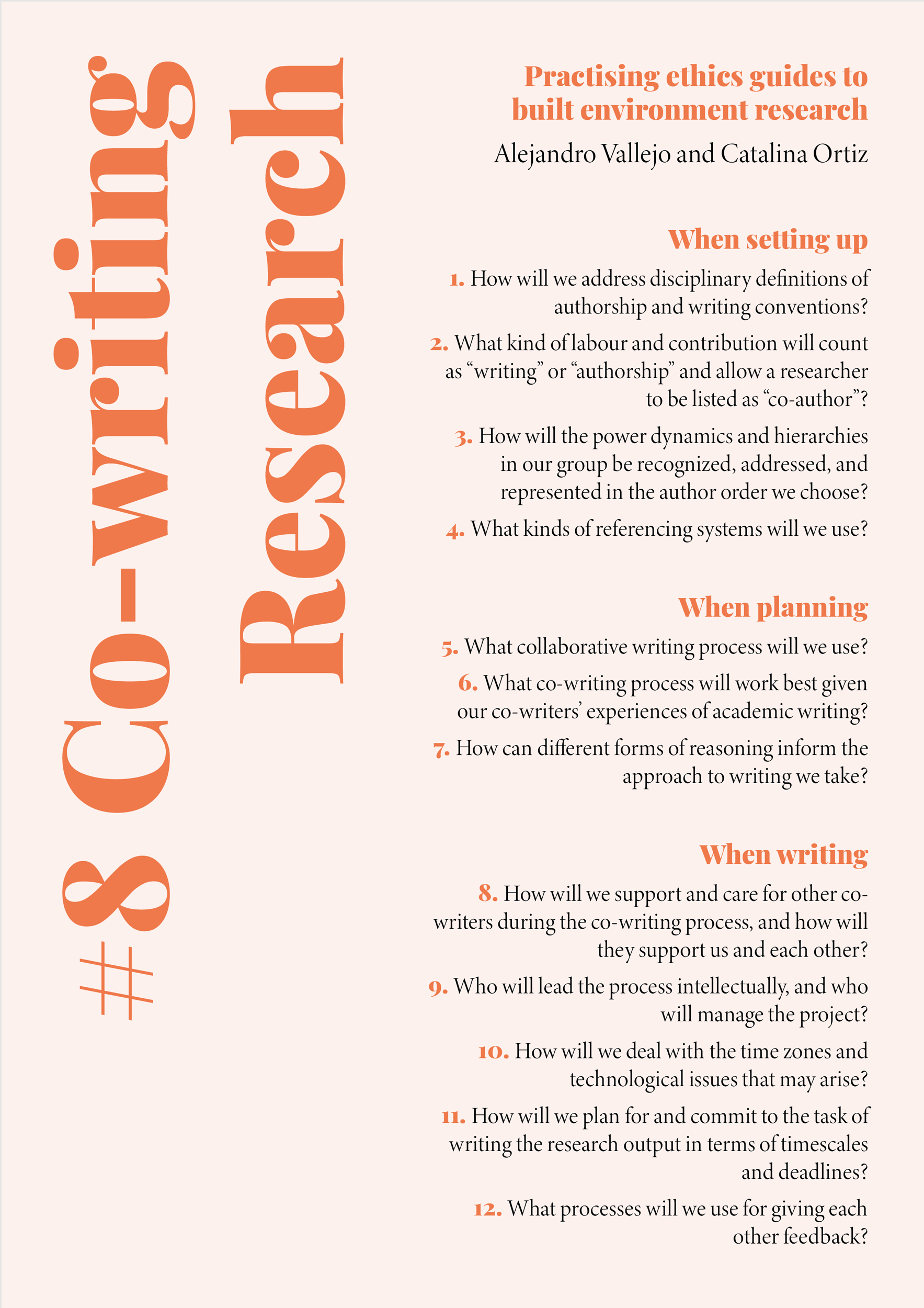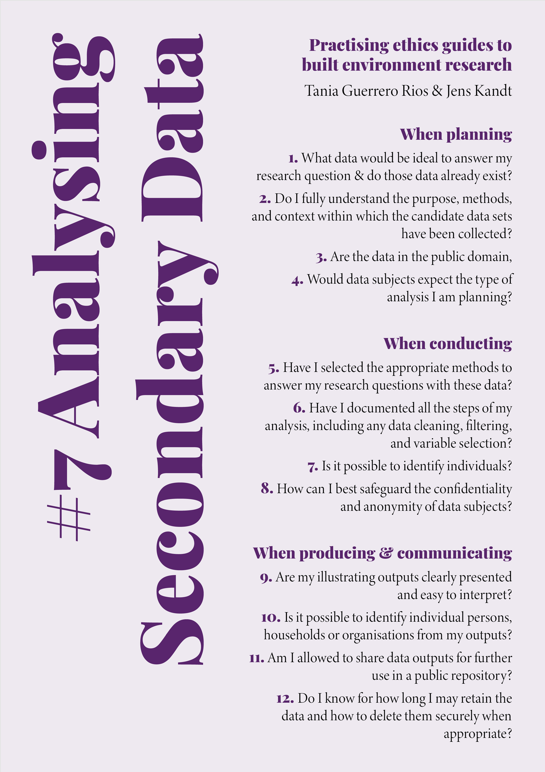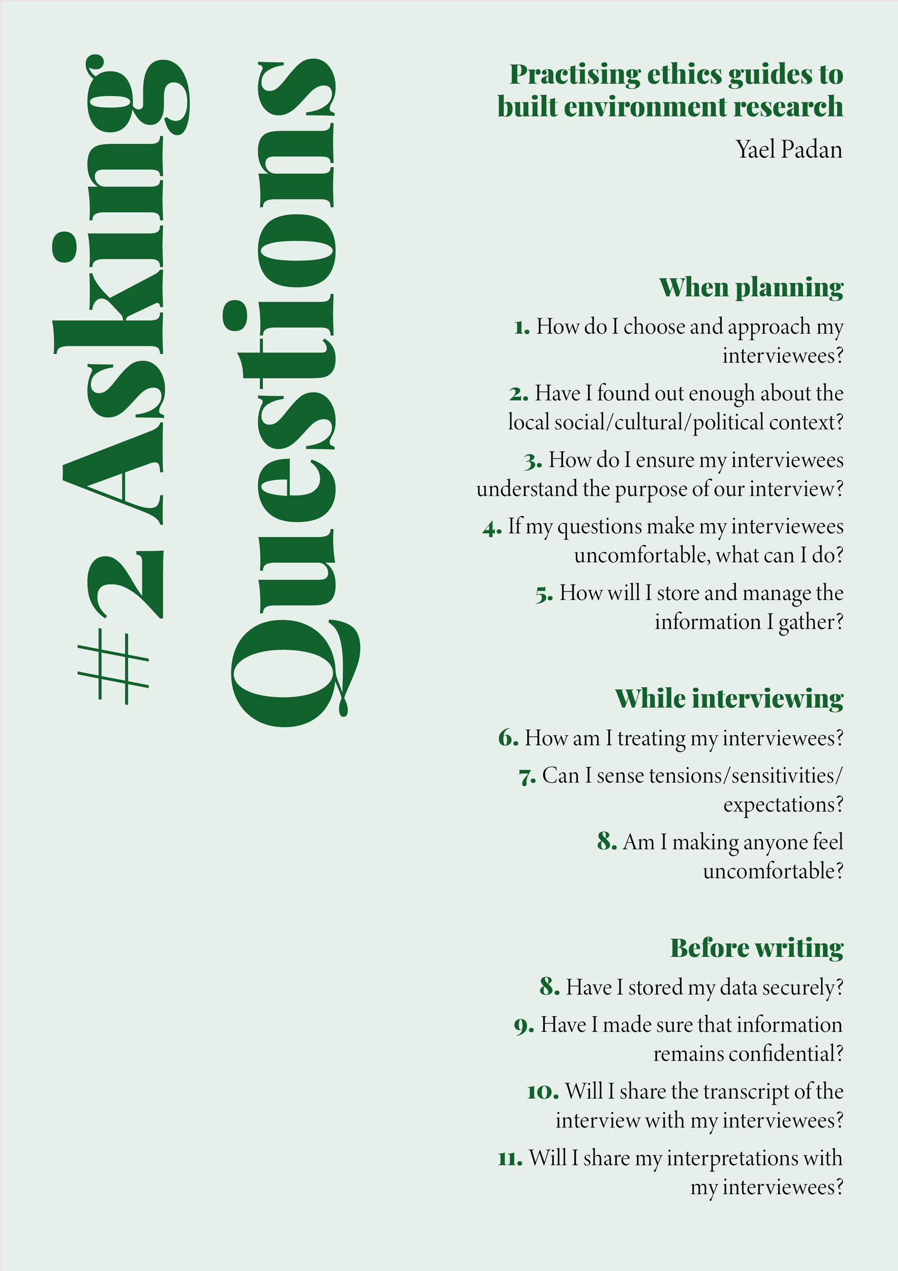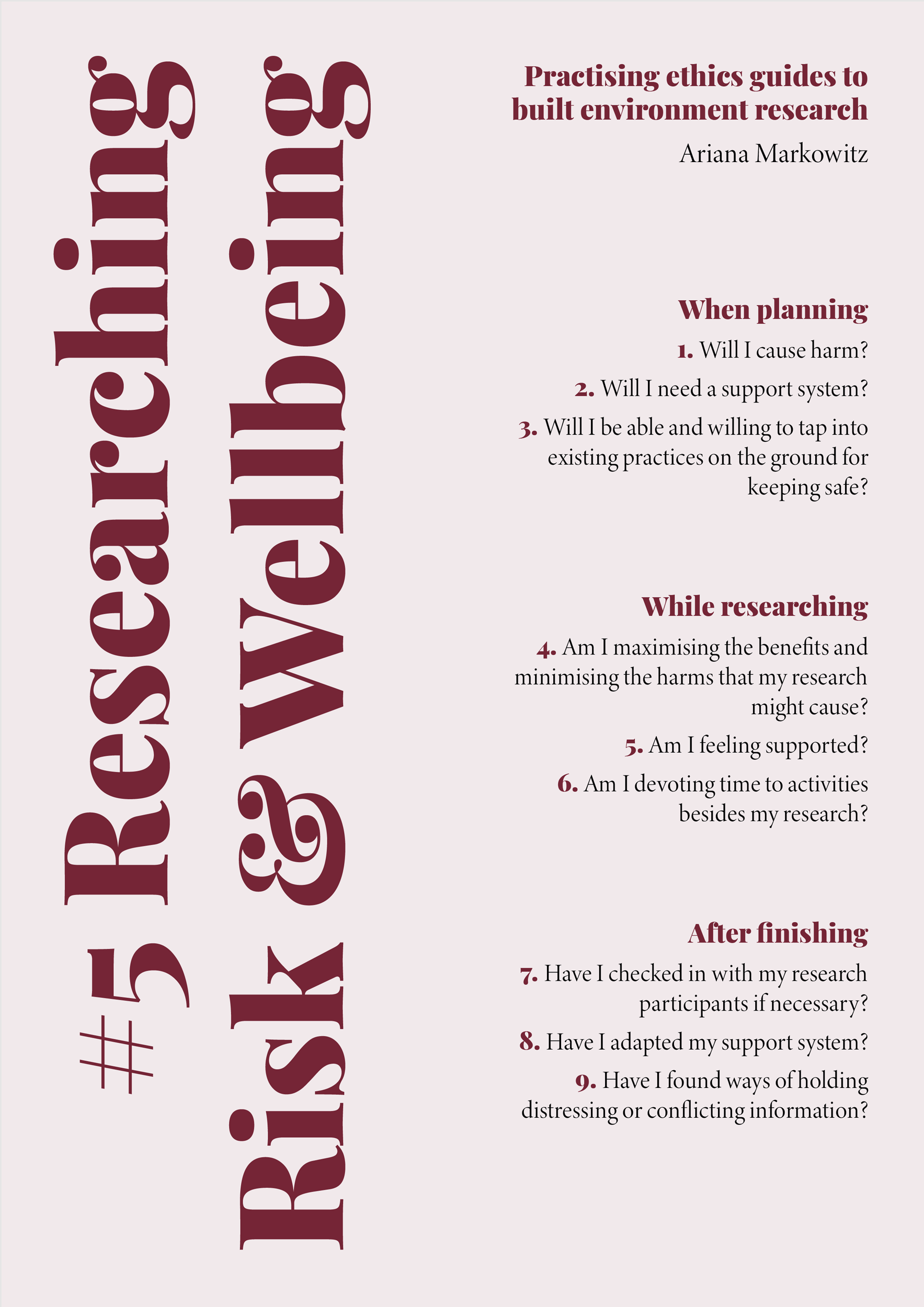 As our aim has been to help readers practise their research ethically, from these opening questions I devised the format and structure of the guidelines to follow the path of ethical issues as they might arise during the development of a research process — from planning and conducting research, to communicating and producing outcomes. Each guide opens with a series of guiding questions, acting as prompts to reflect on the potential ethical considerations which emerge throughout a project, before, during, and after research has been conducted. The guidelines proceed to expand on the dilemmas and possible courses of action suggested by reflecting on the questions, illuminating the different ethical concerns they raise, and recommending actions.