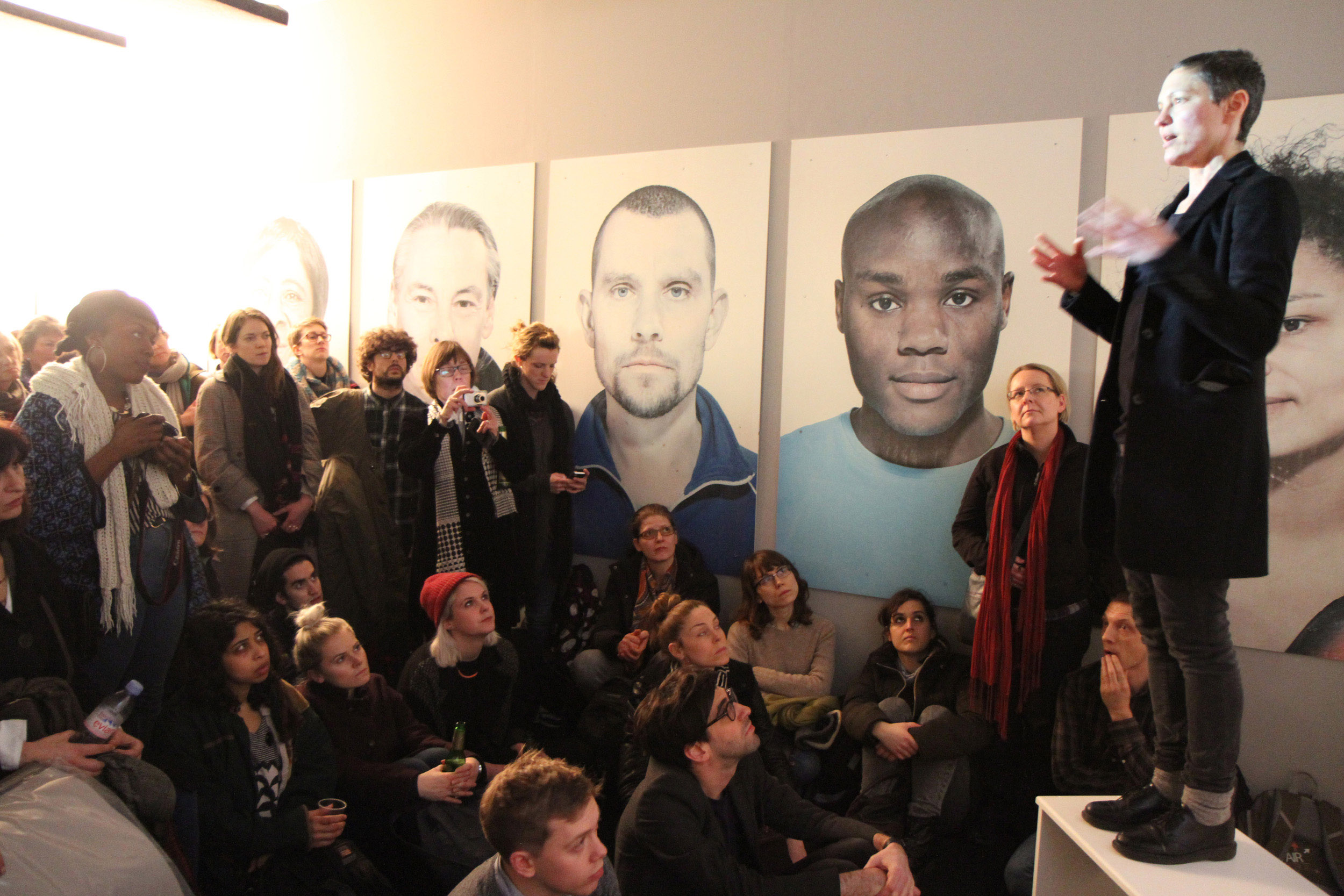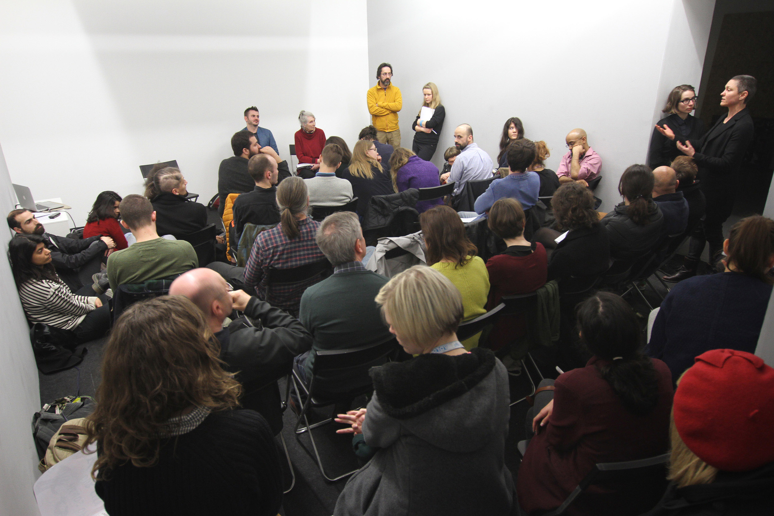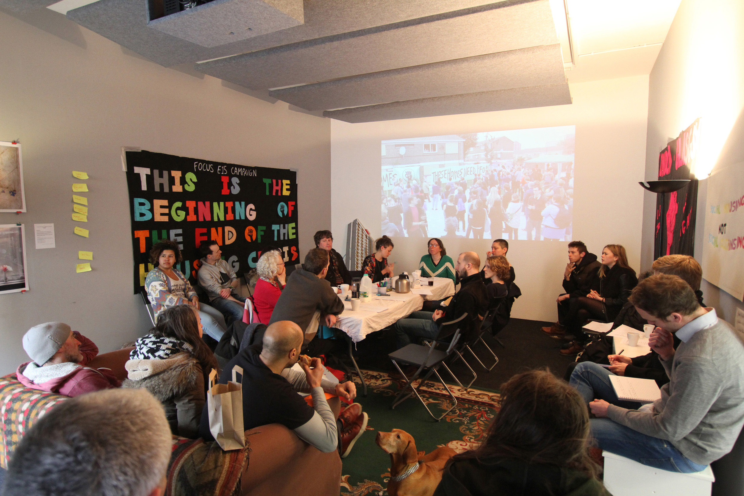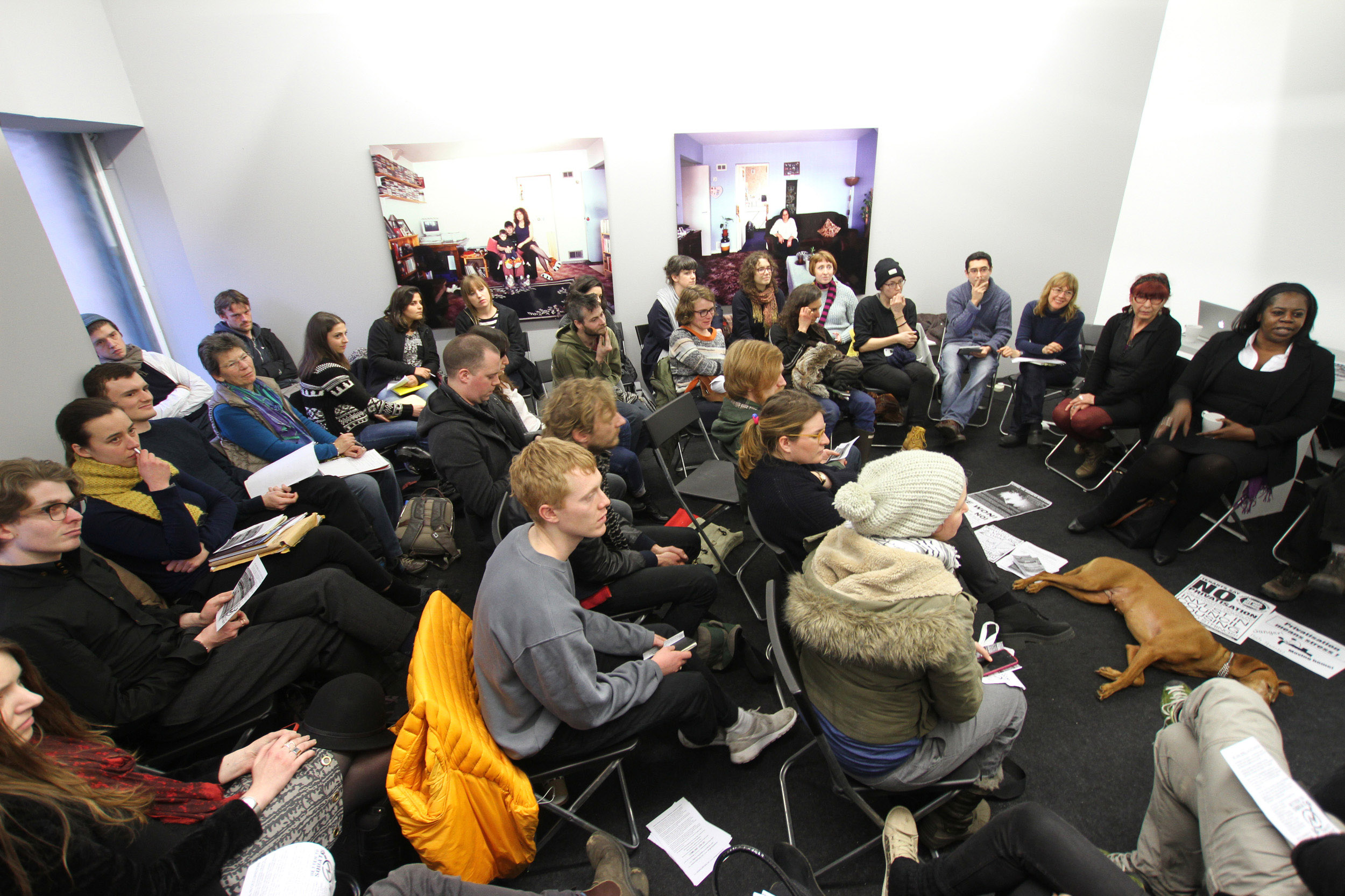 The west gallery was devoted to twice-daily events. Andrea and I coordinated the programme to ensure that live campaigns were located as part of a wider movement, both geographically and historically. This was developed with a programme of talks, screenings of artists’ films and activist documentaries, alongside workshops on eviction resistance, migrant housing rights, legal defence and squatting advice in which public housing as a matter of common concern was shared, and modes of resistance developed and supported.