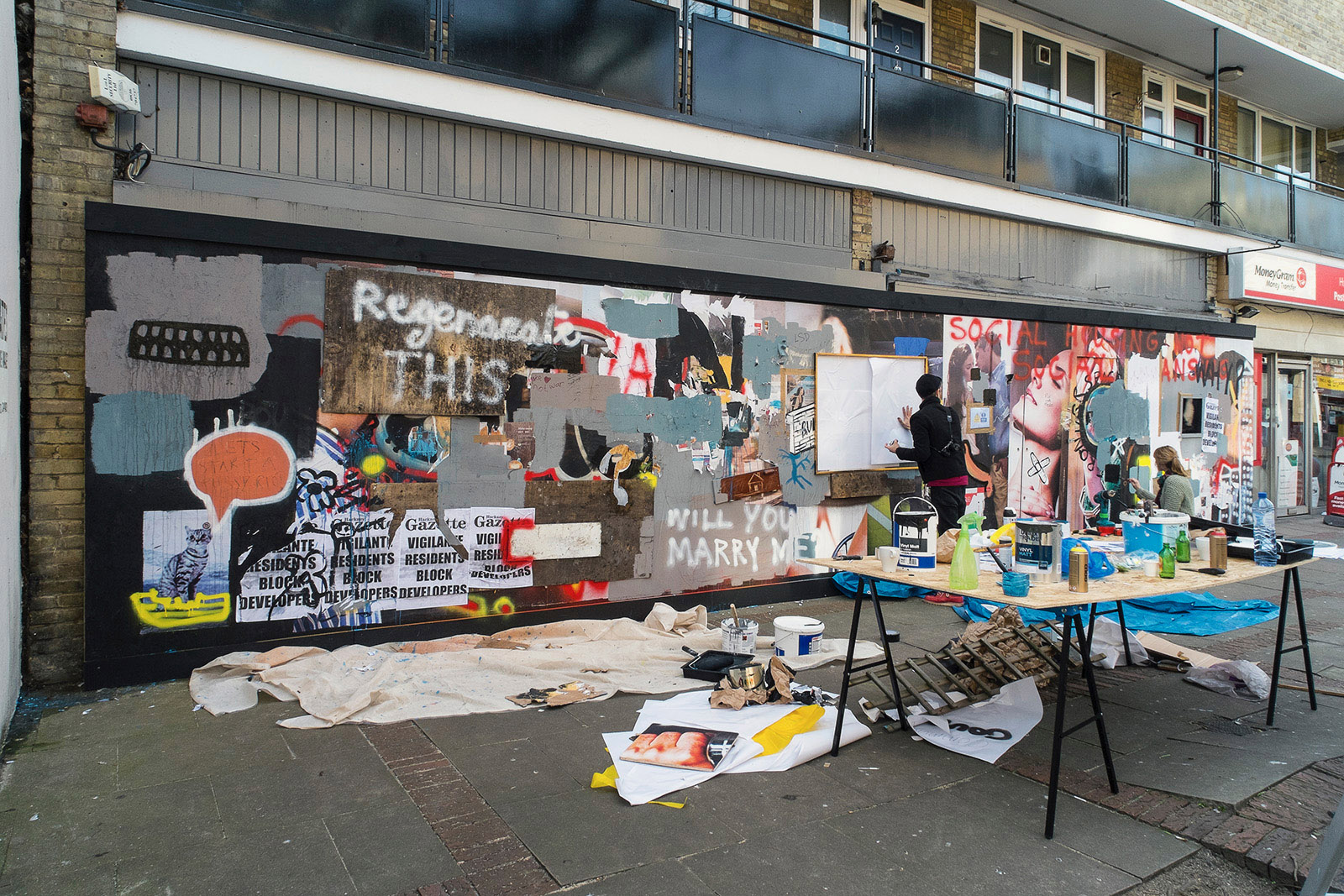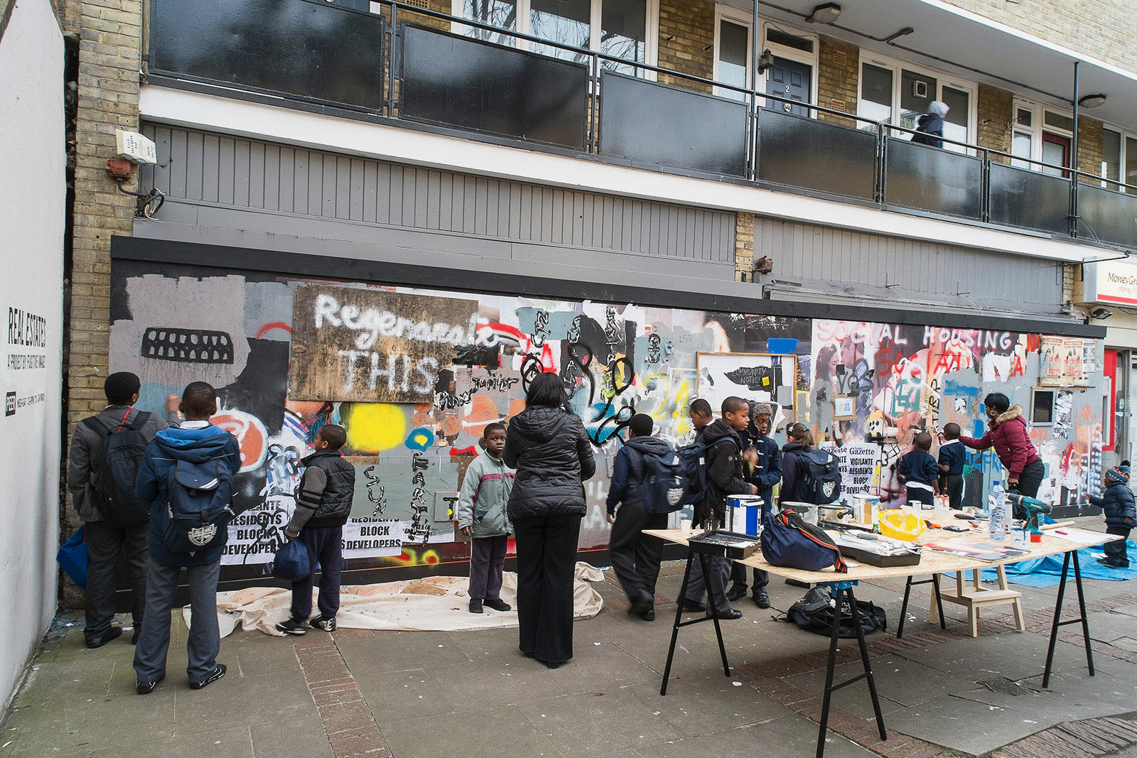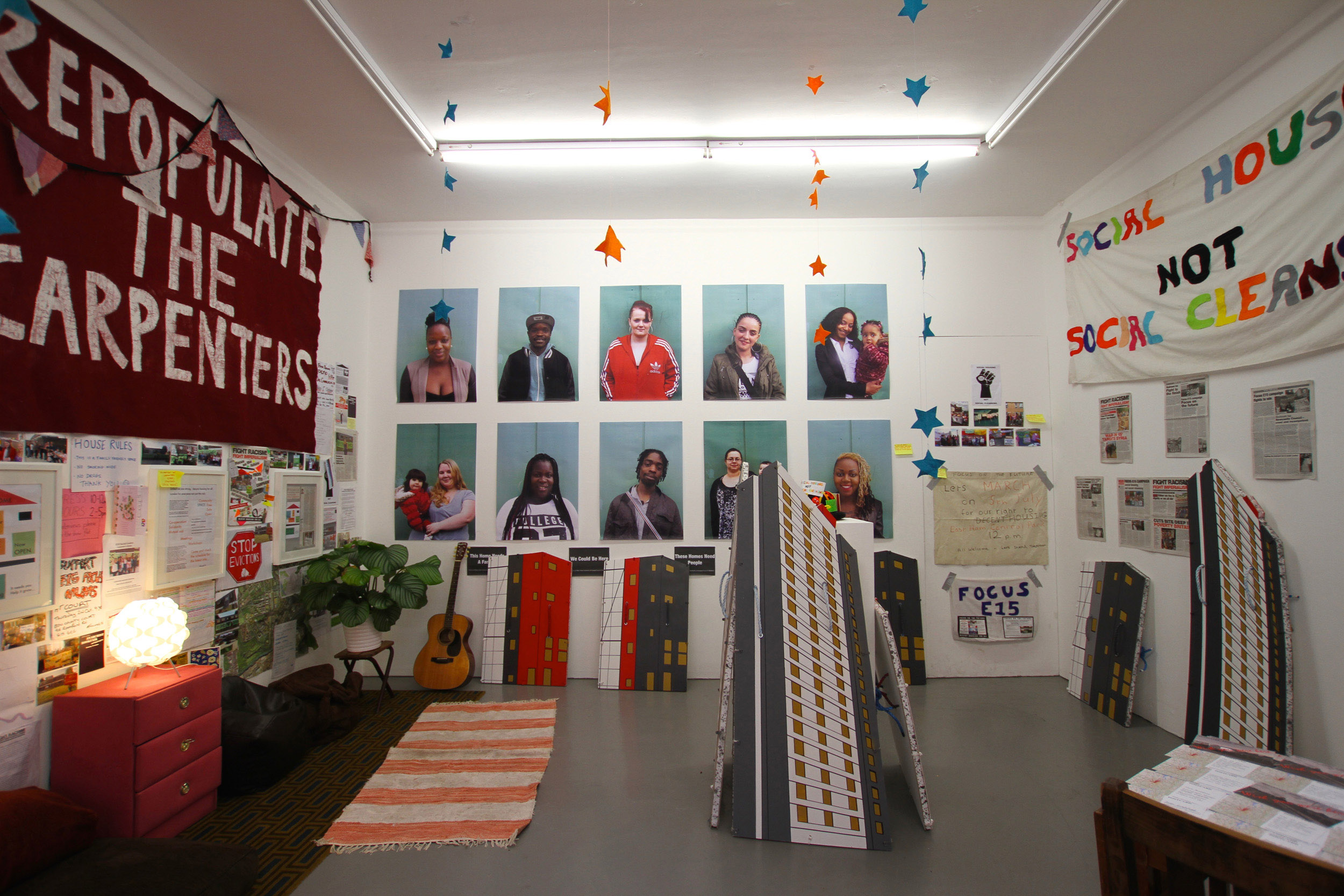 We had initially pitched a proposal for the transformation of the gallery to act as a community and campaign base for the residents of the neighbouring New Era Estate which, at that time, was embroiled in a public campaign to stop a sell-off which would entail a tripling of their rents. The unexpected success of this campaign prompted us to broaden our focus, as it demonstrated a growing potential for effective change as well as a wider public concern for housing issues. We re-oriented our programme to expand the scope for collaboration and create a space where successful strategies, such as New Era’s, could be shared more widely. We developed a programme to unite other live campaigns across London; north-east – Focus E15 Campaign on the Carpenters Estate, north-west – West Hendon Estate, south – Aylesbury Estate, south-east – Excalibur Estate, south-west – Cressingham Gardens.