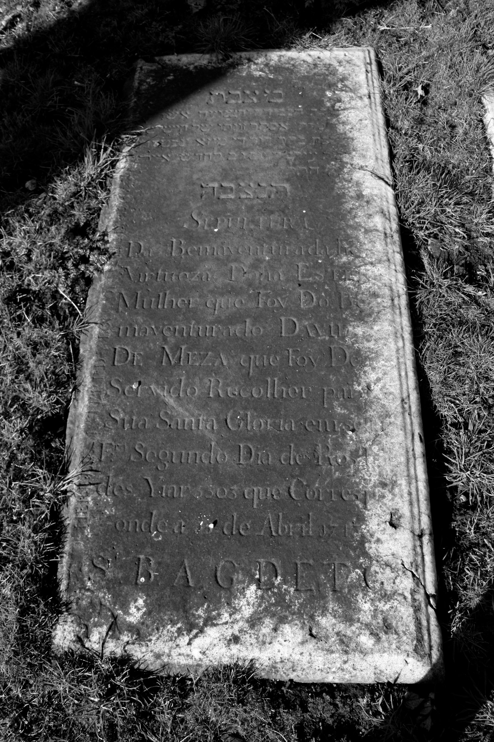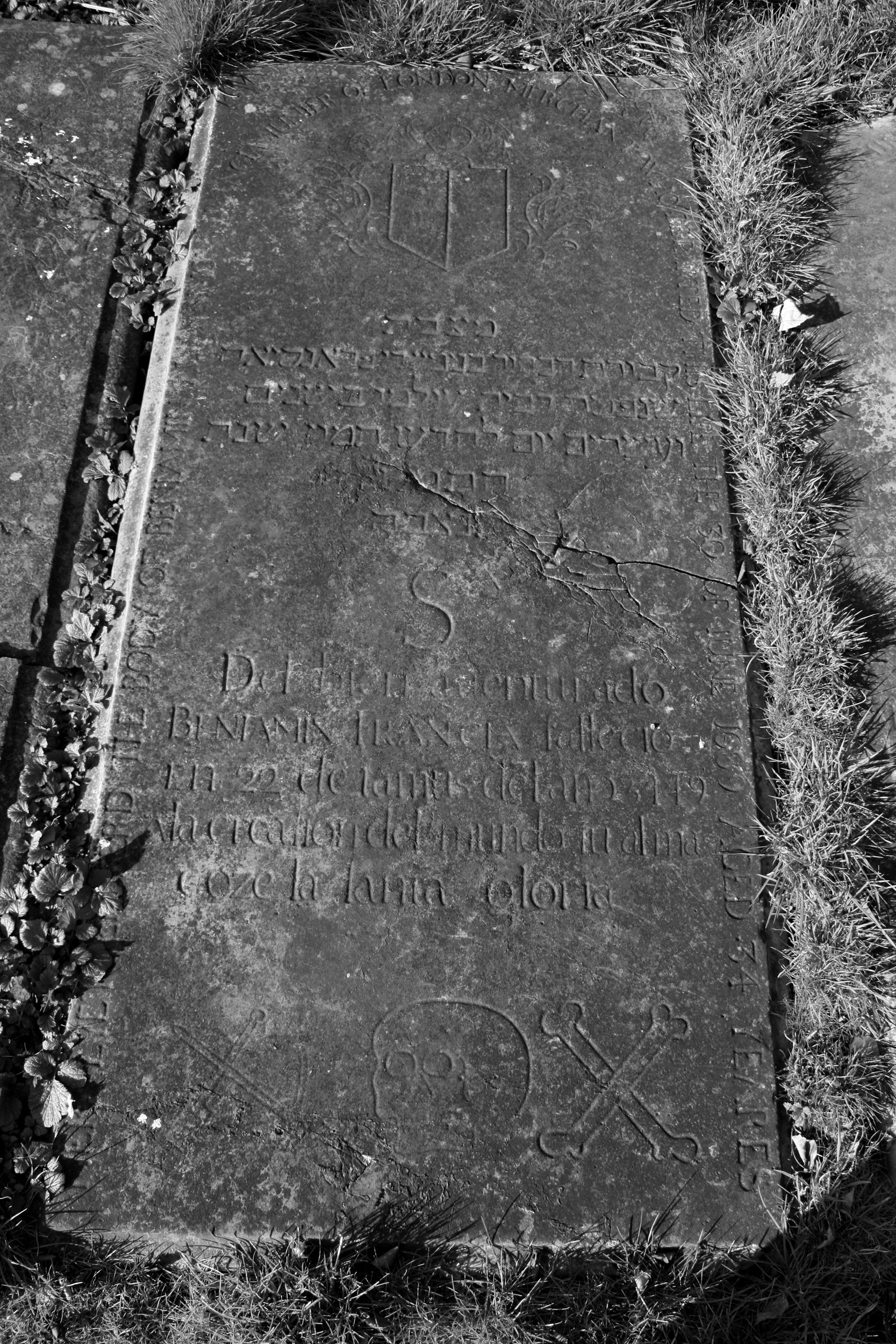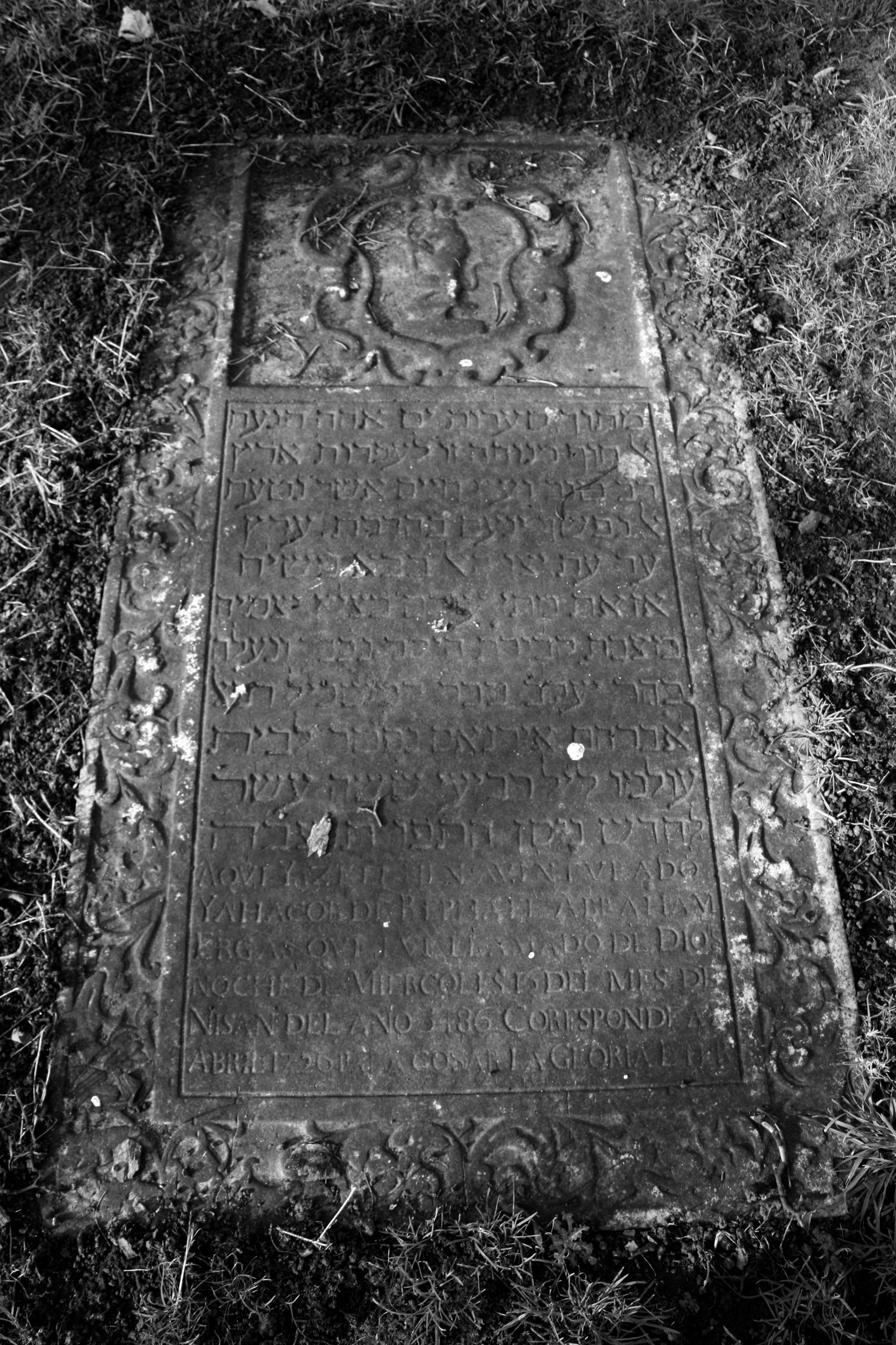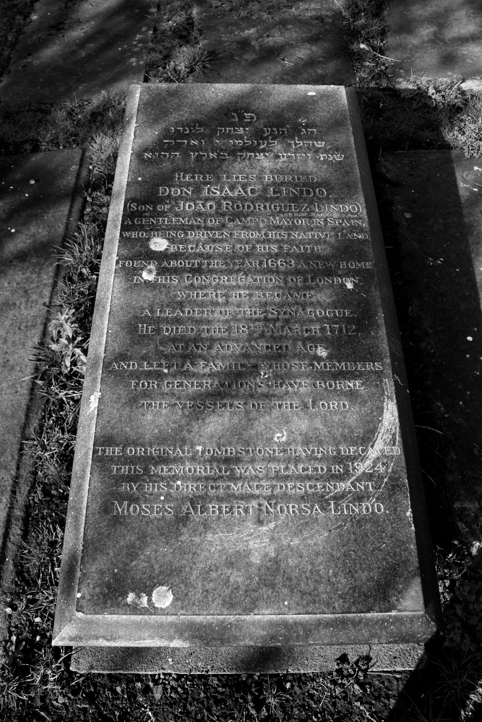 It is raining softly and I am not a trustworthy narrator. In the pale light I leave Mile End Road at the western fringe of Queen Mary College, where mattresses slouch in line by Stepney Fried Chicken and the veiled bus queue spills on to the blue cycle superhighway. I reach a pointed arch timber doorway on a high wall beyond which lies a cemetery, a small plot not even an acre marked by over a thousand graves, enclosed on all sides by student halls and garden walls of terraced cottages. The tombstones rest flat to the earth, not one with an upstanding tablet. In twenty-three rows they keep close company, bare stone or wreathed in moss that clings to this old world, full oblong or shattered and absorbed into the ground, ties of blood woven together by the roots of sixteen trees that split and swallow manuscript. Some inscriptions are still legible today, cut in Portuguese and Hebrew, some Spanish, few English, recording little more than foreign names and dates and the rare indulgence that paints portraits of this community in quick strokes, ‘the bird catcher’, ‘sweet poet’, ‘maiden’, ‘son of the harp player’. Others are worn plain until this rain collects and fills faint hollows, and for a moment their ancient epitaphs gleam, complete, then are gone, overflowing as tributaries branch and blot from word to word when, flooded, the stones become a mirror...