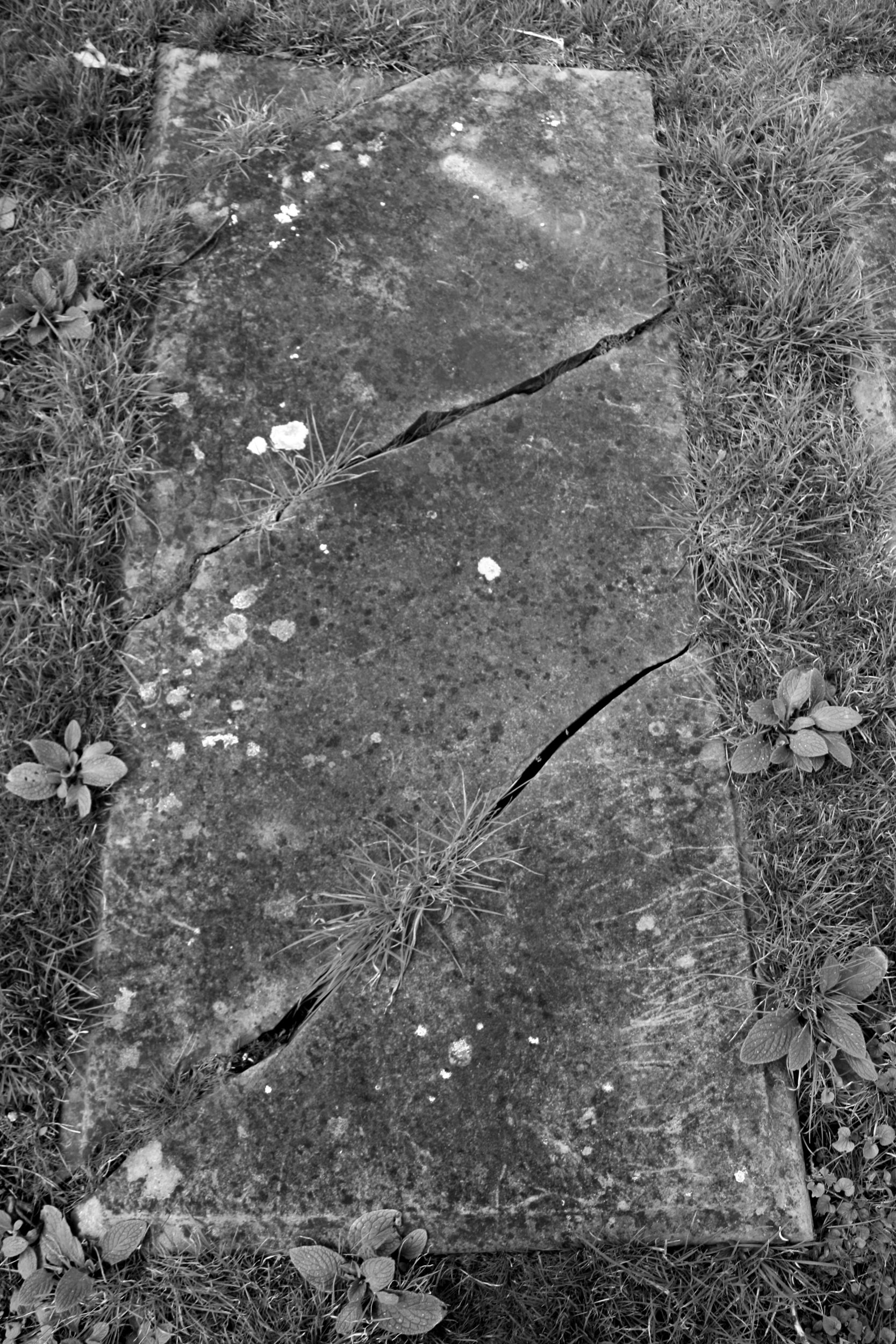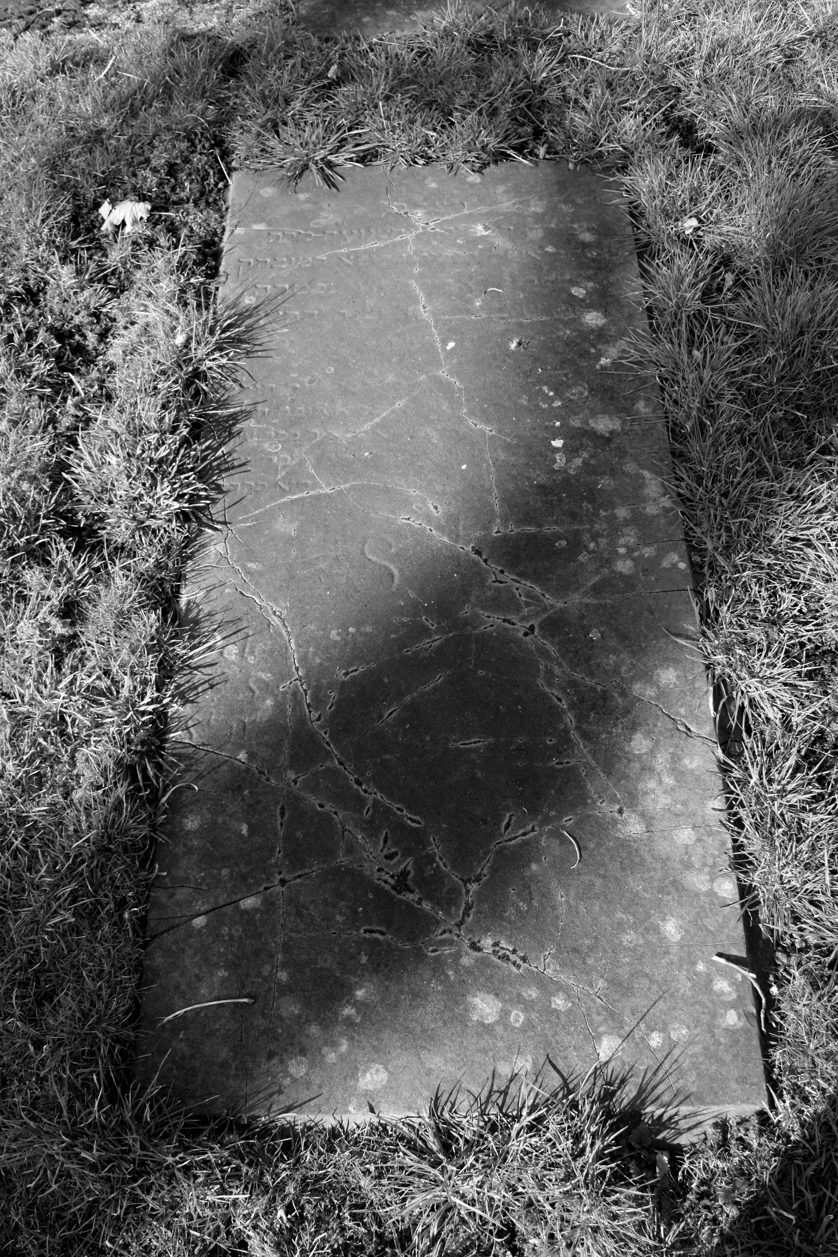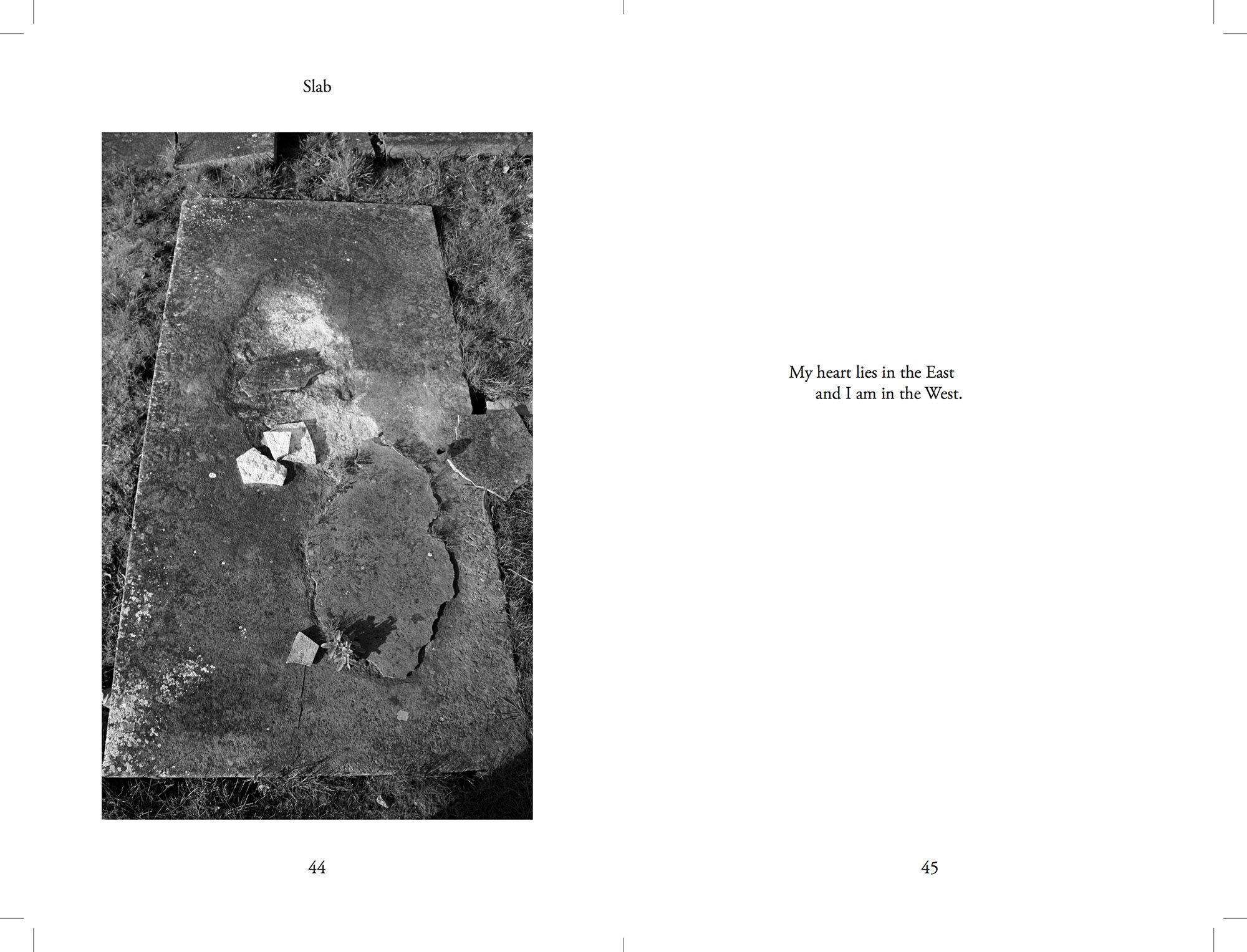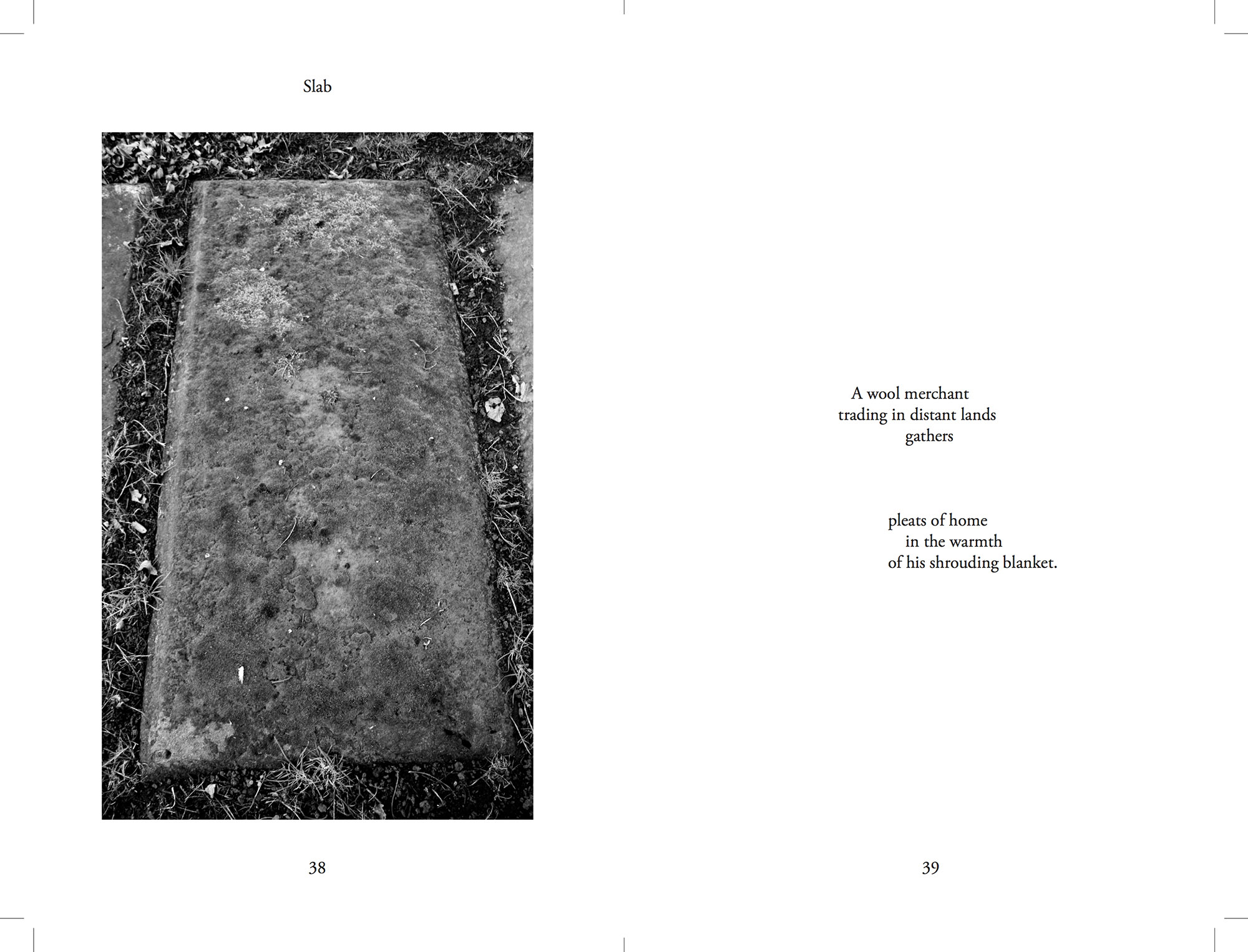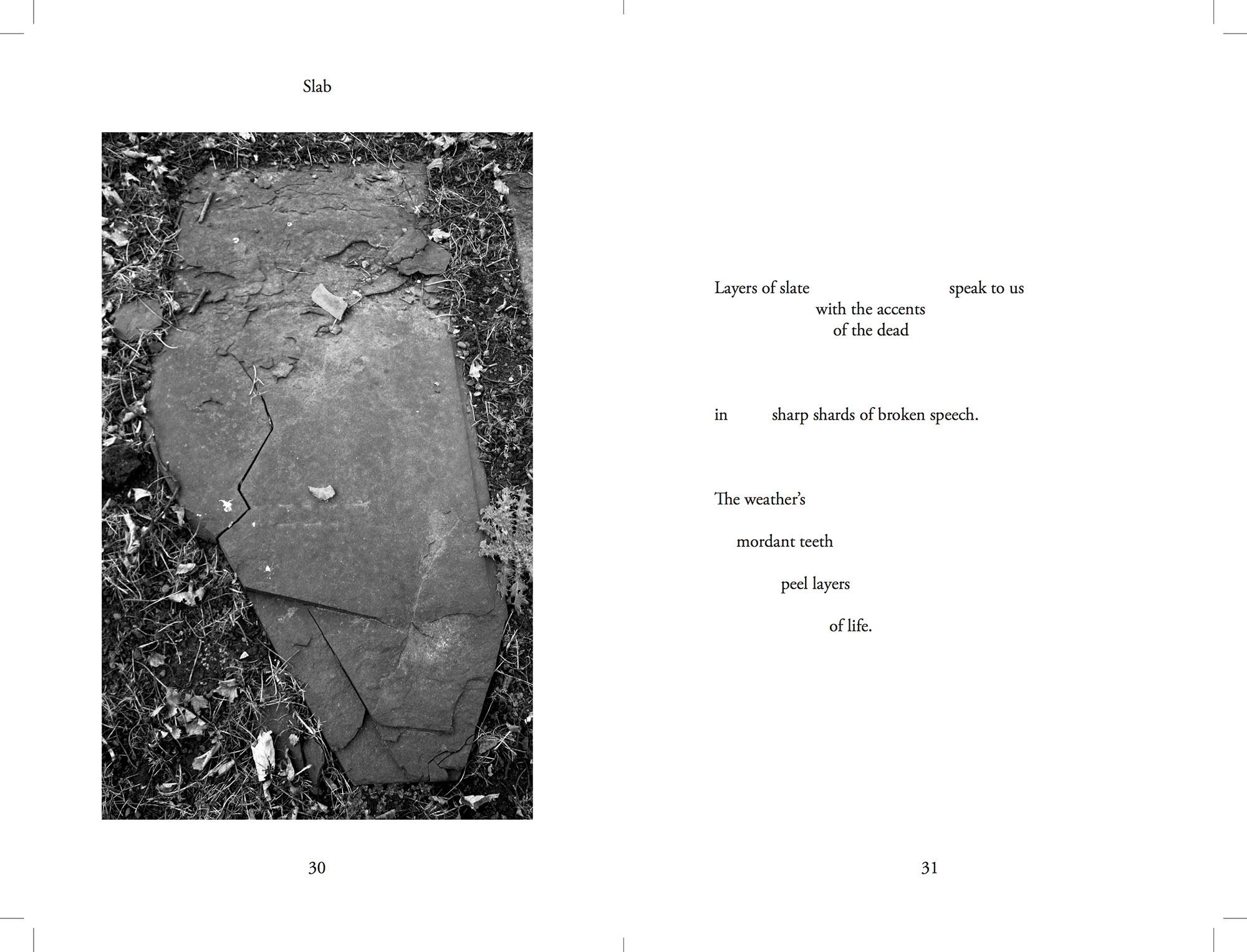 Slab is a collection of concrete poems and photographs based on the Velho Sephardic Cemetery in which tombstones rest flat to the earth, wreathed in moss, shattered and absorbed into the ground.